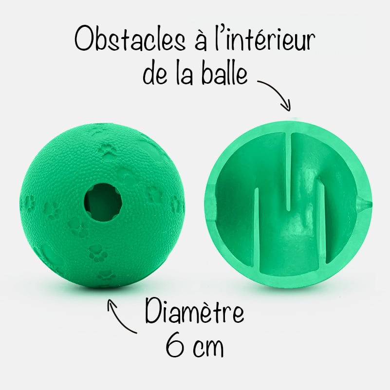 Cette balle creuse en caoutchouc naturel, de 6 cm de diamètre, comporte des obstacles à l’intérieur qui ralentissent la distribution des friandises ou des croquettes lorsque le chat la bouscule avec sa patte.