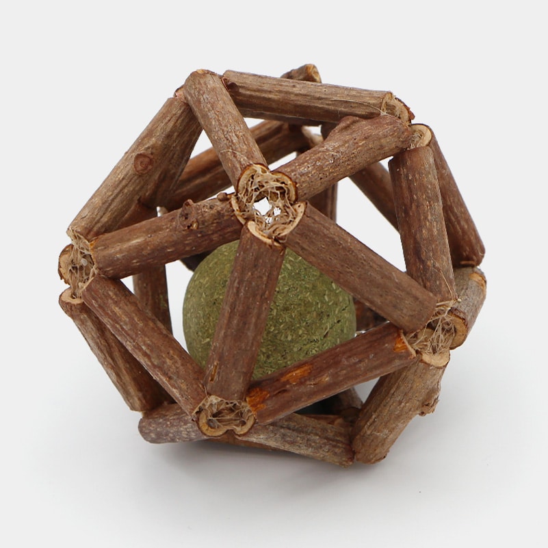 Le jouet est constitué d’une trentaine de petits bâtons de matatabi, reliés entre eux avec un lien, formant ainsi une grosse balle de 8 cm de diamètre.
