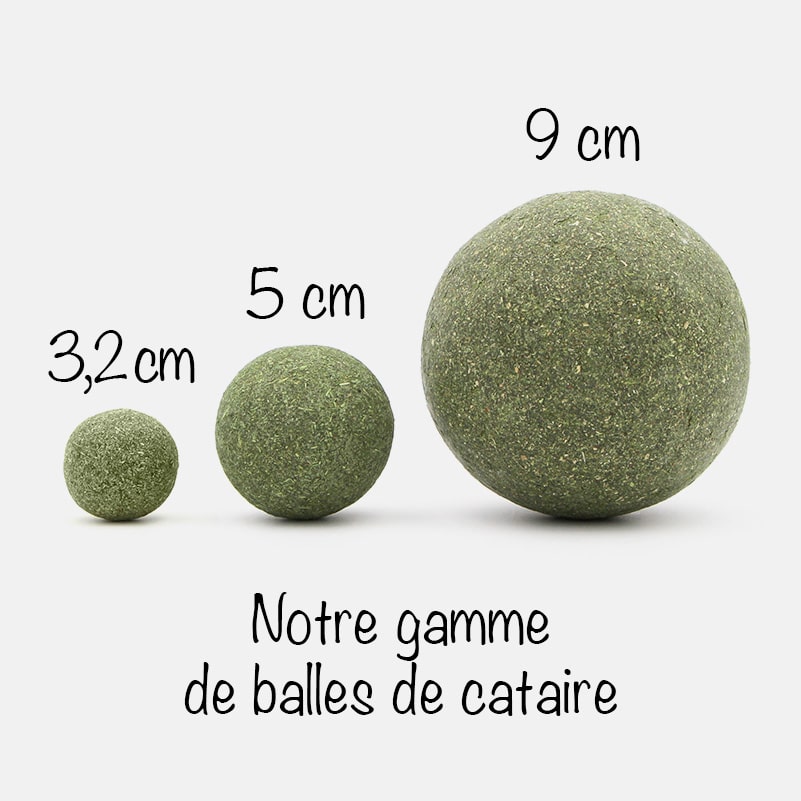 Cette balle de cataire est également disponible en plus petit format de 3,2 cm et moyen format de 5 cm de diamètre.