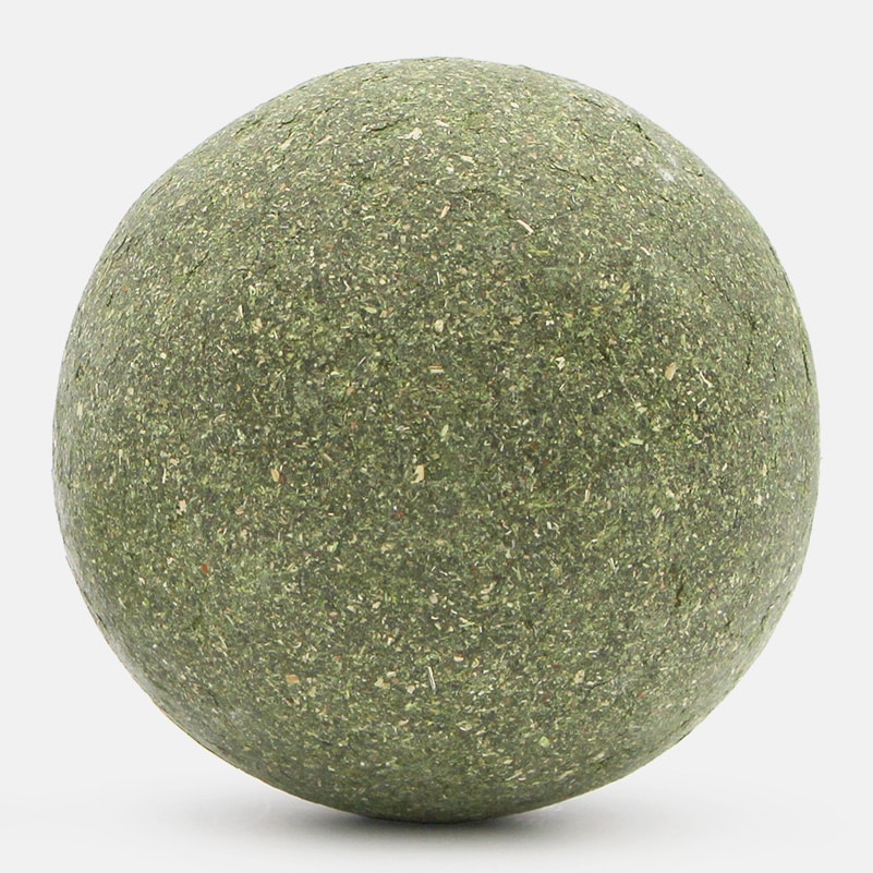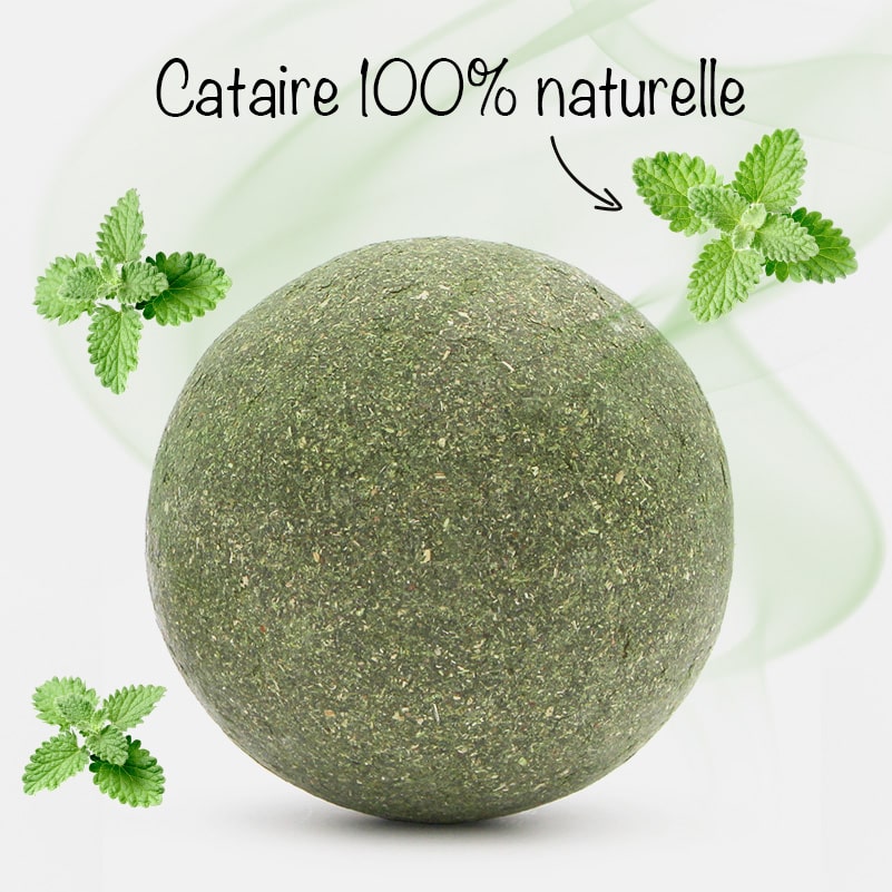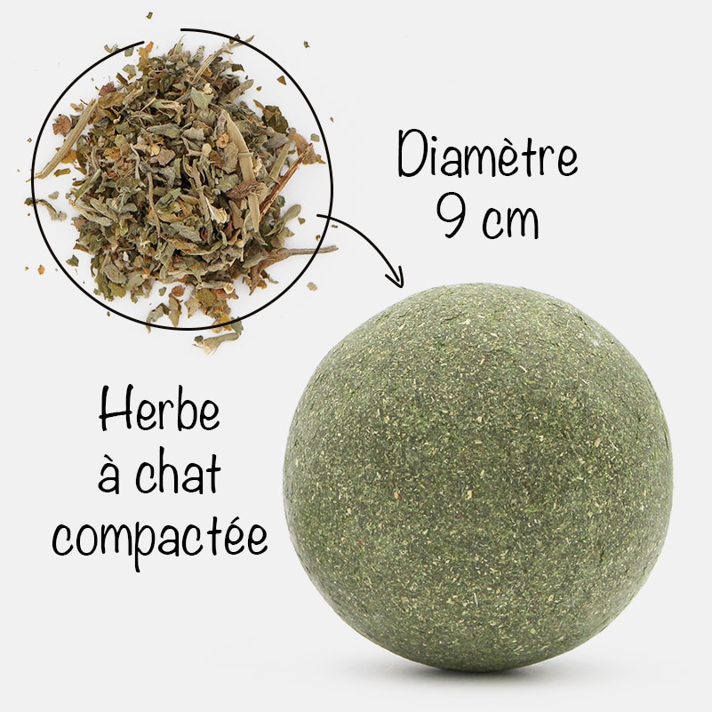 Cette balle de 9 cm de diamètre est constituée d’herbe aux chats compactée 100% naturelle. L’herbe aux chats regroupe différentes plantes comme la cataire, appelée également menthe à chat ou catnip. La cataire est une plante aromatique qui attire irrésistiblement les chats et provoque un effet euphorisant.