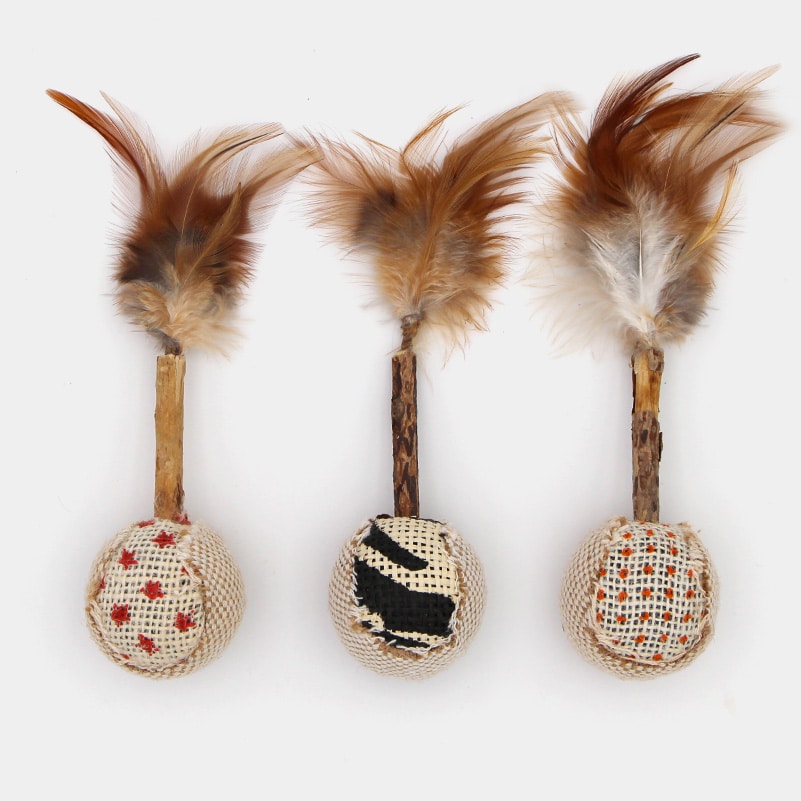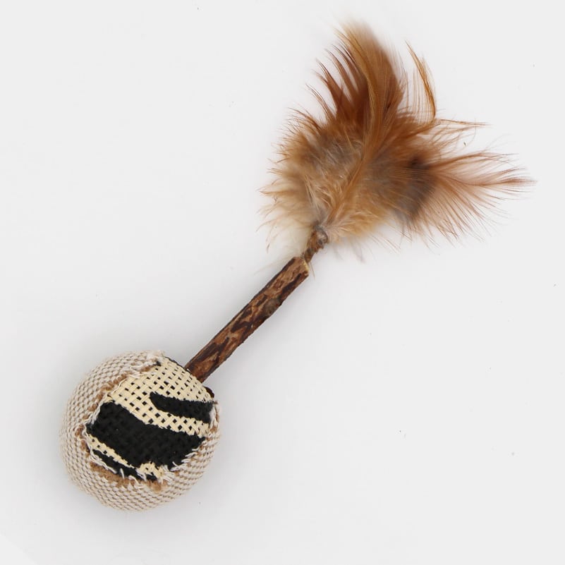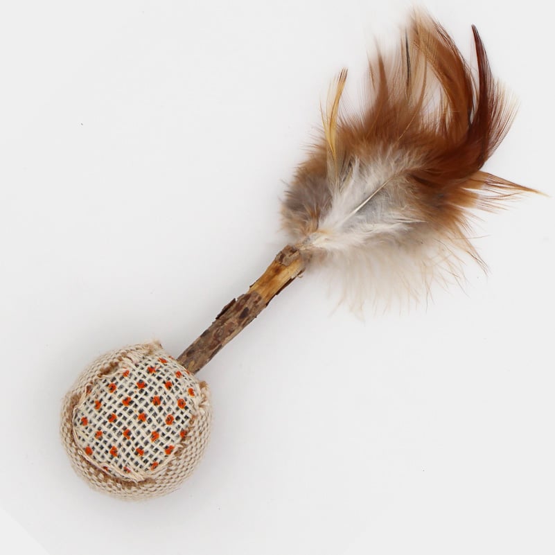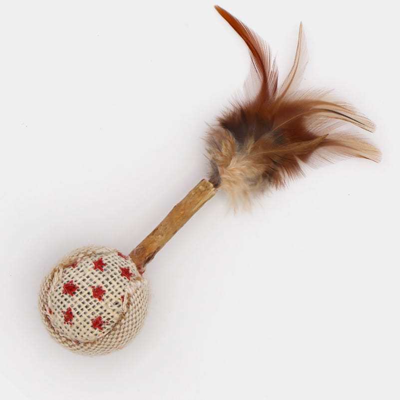Une petite balle fixée à un bâton de matatabi avec des plumes qui invite votre chat à jouer !