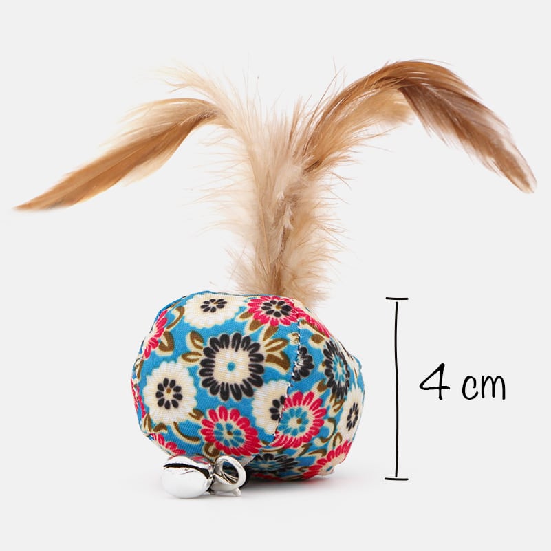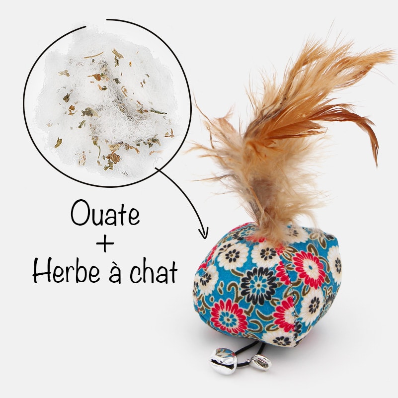 Avec son motif à fleurs, cette balle toute mignonne en tissu bleu ou marron stimulera l’instinct de chasse de votre chat. La balle est agrémentée de plumes qui virevolteront lorsque votre chat jouera avec et la lancera dans les airs avec ses pattes. le bruit d’un grelot se fera également entendre.