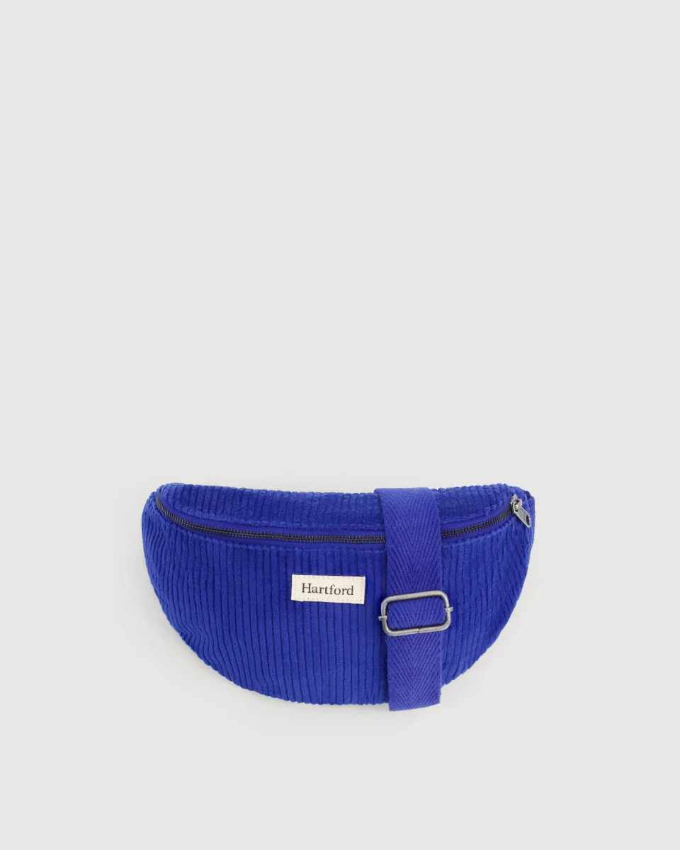 Sac banane en velours côtelé avec étiquette écru Hartford sur le devant. Fermeture par glissière et taille ajustable grâce à une patte de serrage sur la anse.