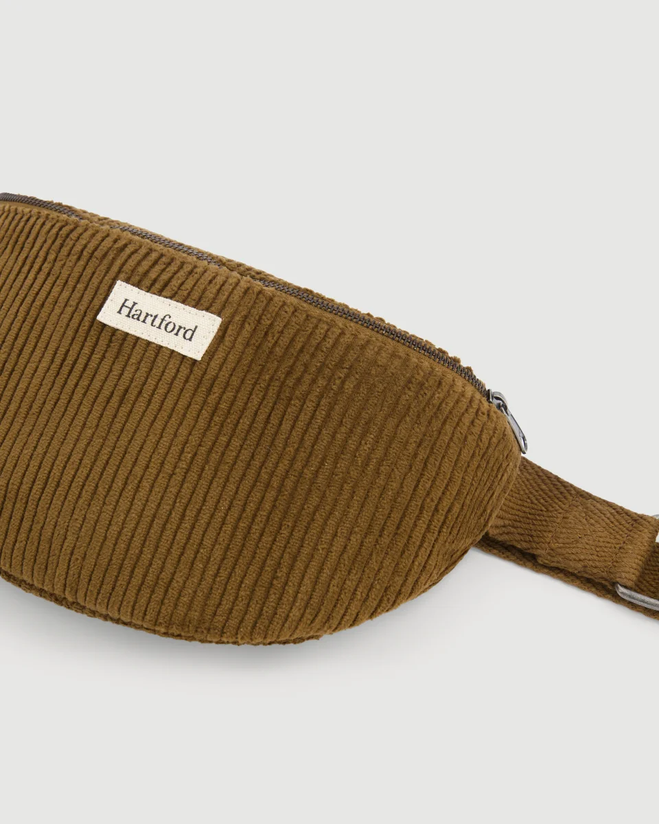 Sac banane en velours côtelé avec étiquette écru Hartford sur le devant. Fermeture par glissière et taille ajustable grâce à une patte de serrage sur la anse.