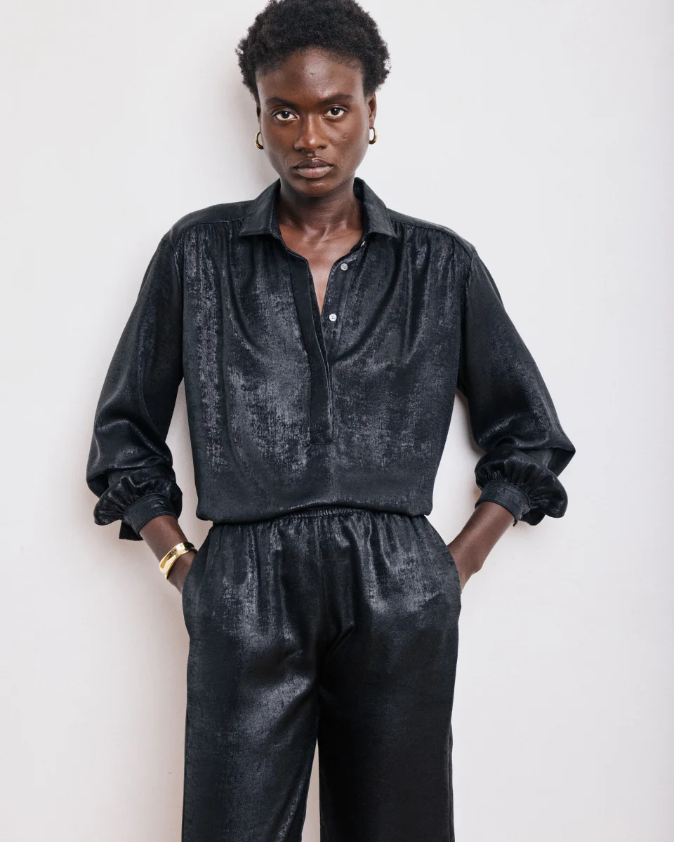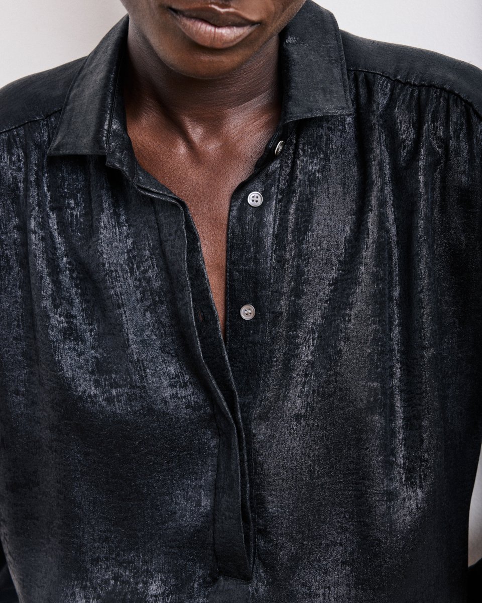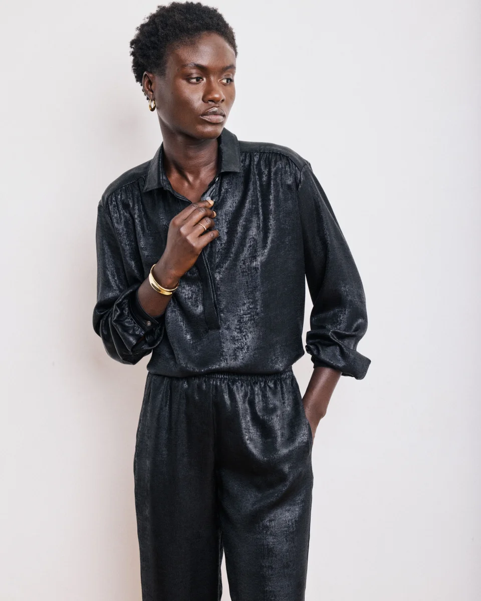 Blouse femme ample en lamé noir à col chemise avec demi patte de boutonnage invisible. Emmanchures tombantes et détails de fronces aux épaules et au dos. Bas liquette.