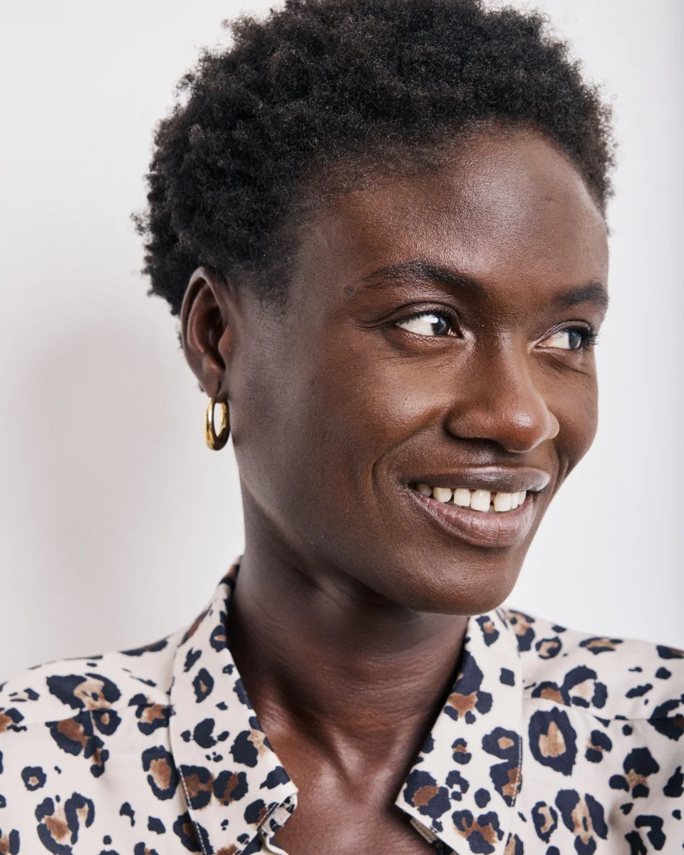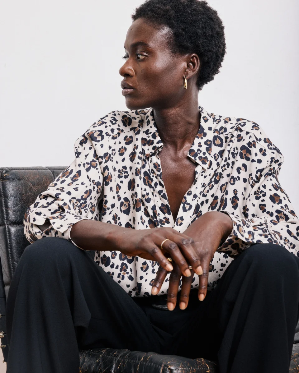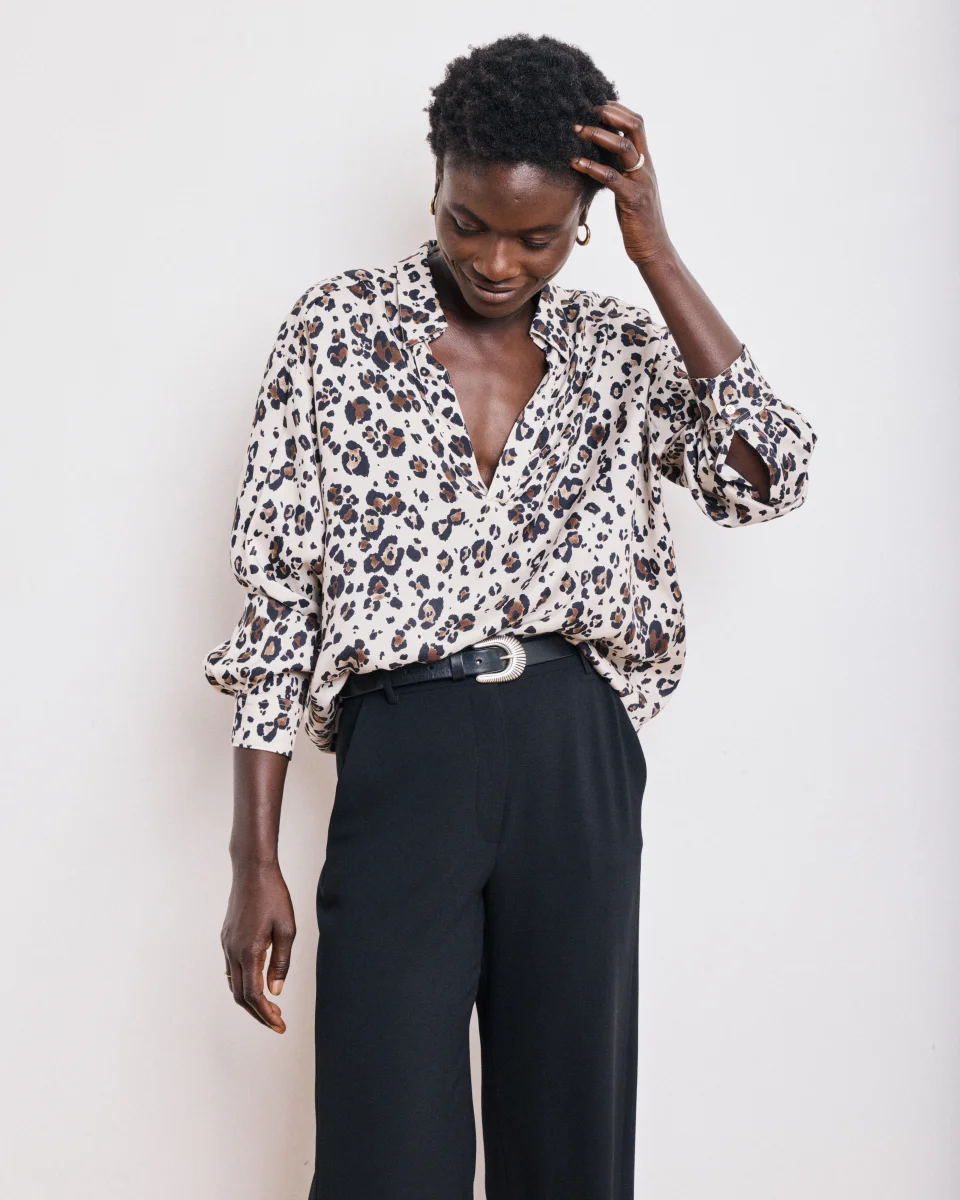 Blouse femme ample en satin de viscose imprimé léopard exclusif à col polo avec ouverture en V. Emmanchures tombantes et bas liquette.