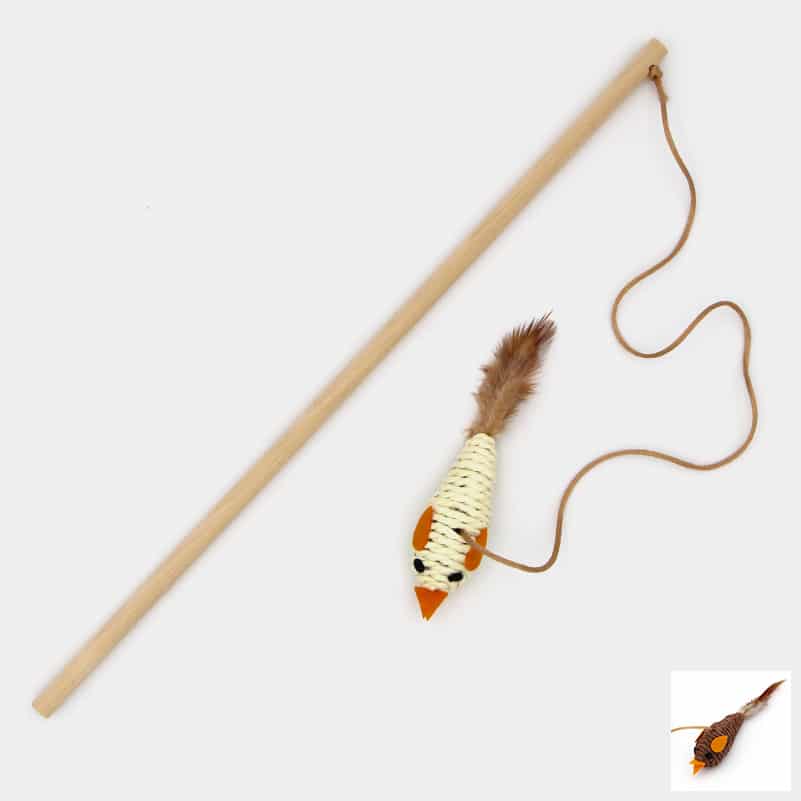 La canne à pêche, un des jouets préférés de tous les chats ! Fabriquée à partir de matières naturelles, cette canne à pêche éveillera la curiosité de votre chat et stimulera son instinct de chasseur. Elle sera également un moment de complicité et d’échange avec votre petit compagnon.