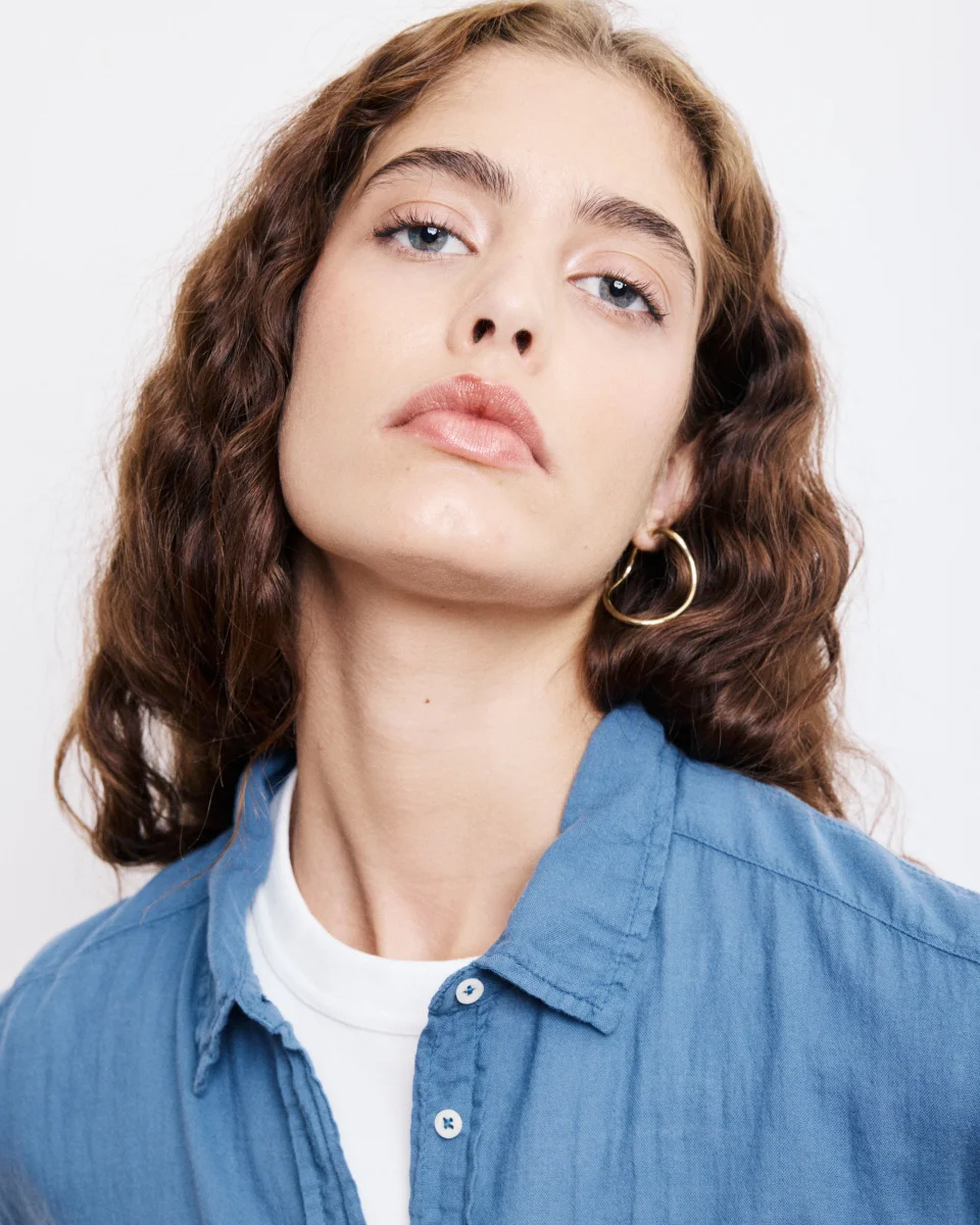 Chemise femme coupe « boxy » ample et droite. Emmanchures légèrement tombantes. Patte de boutonnage apparente avec boutons en nacre. Poche poitrine.