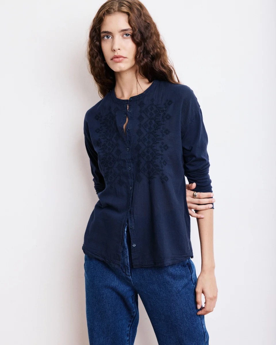 Chemise femme sans col avec détails de broderies sur le devant. Patte de boutonnage apparente avec boutons en nacre. Emmanchures tombantes.