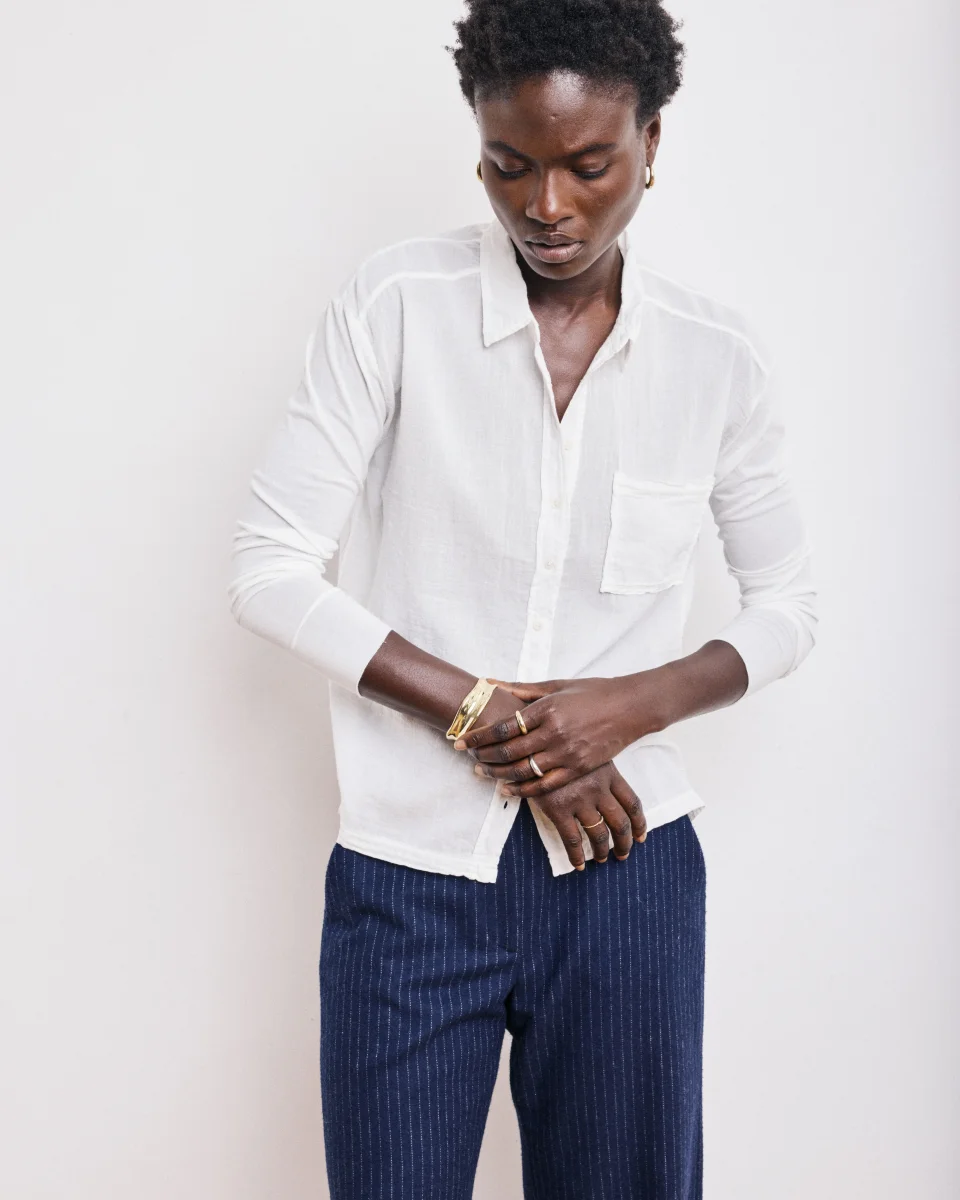 Chemise femme coupe « boxy » ample et droite. Emmanchures légèrement tombantes. Patte de boutonnage apparente avec boutons en nacre. Poche poitrine.
