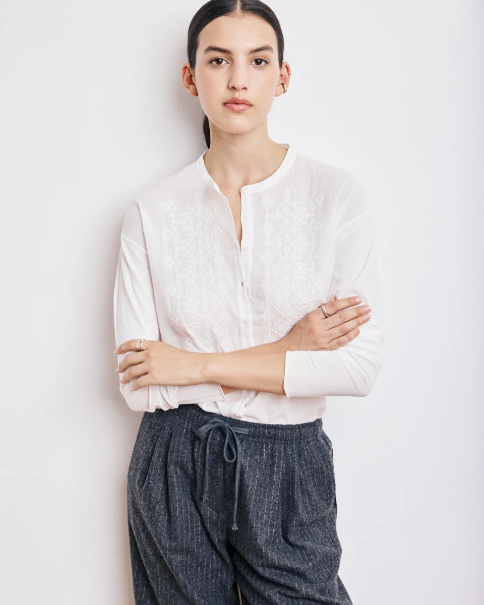 Chemise femme sans col avec détails de broderies sur le devant. Patte de boutonnage apparente avec boutons en nacre. Emmanchures tombantes.