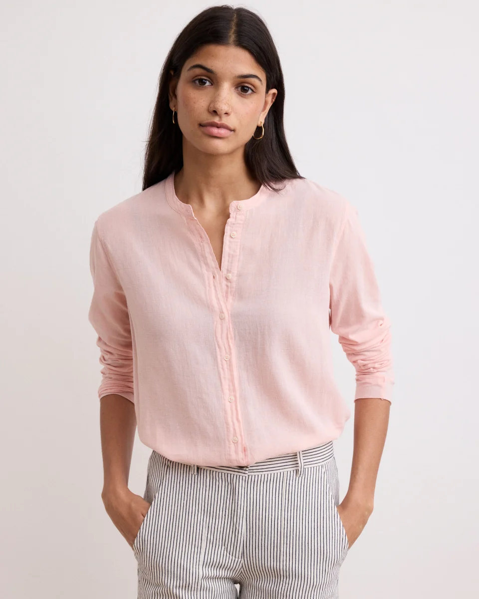 Chemise femme sans col à manches longues en coton bi-matière. Patte de boutonnage apparente avec boutons en nacre. Bas liquette.