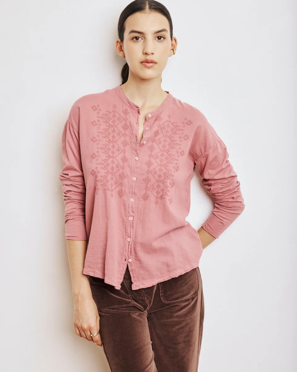 Chemise femme sans col avec détails de broderies sur le devant. Patte de boutonnage apparente avec boutons en nacre. Emmanchures tombantes.