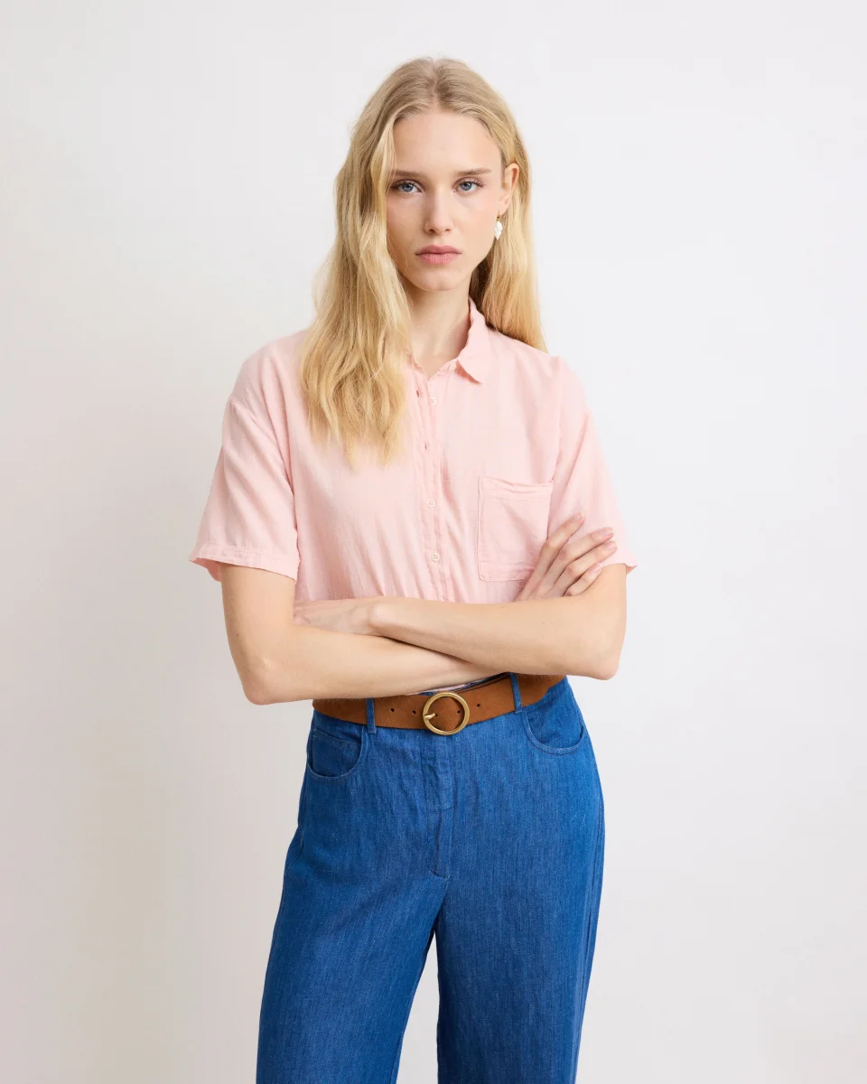 Chemisse femme à manches courtes en coton bi-matière. Patte de boutonnage apparente et poche poitrine.