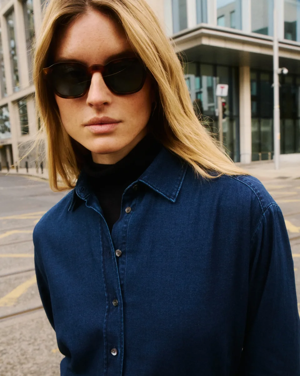 Chemise femme ample en twill de coton indigo à manches longues. Emmanchures légèrement tombantes et patte de boutonnage apparente avec boutons en nacre.