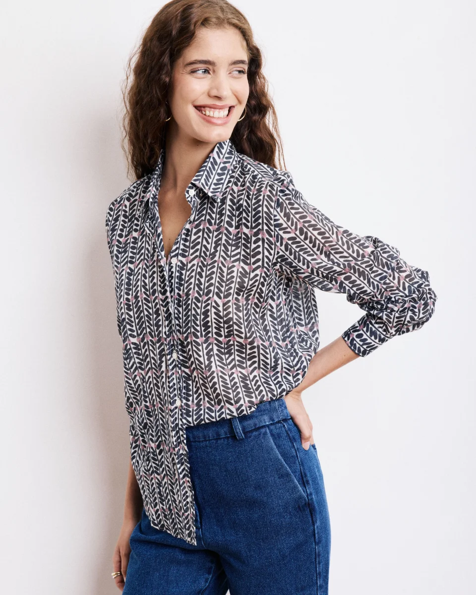 Chemise femme ajustée en voile de coton imprimé exclusif. Patte de boutonnage apparente avec boutons en nacre. Pli d’aisance au dos.