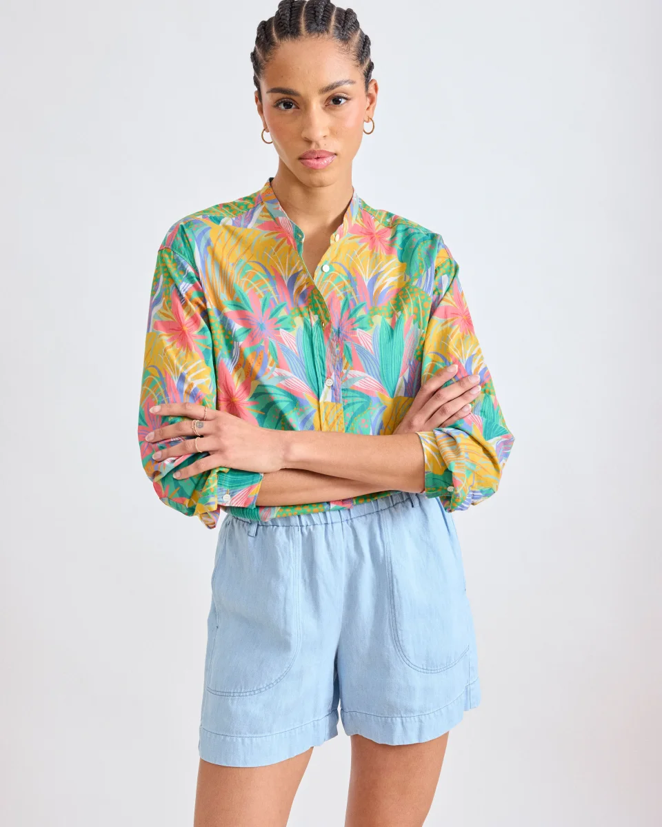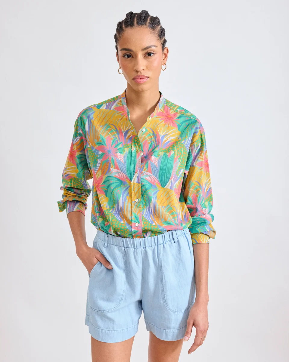 Chemise ample femme sans col en coton imprimé exclusif Jungle. Patte de boutonnage apparente avec boutons en nacre. Plis d’aisance au dos et manches à poignets simples.