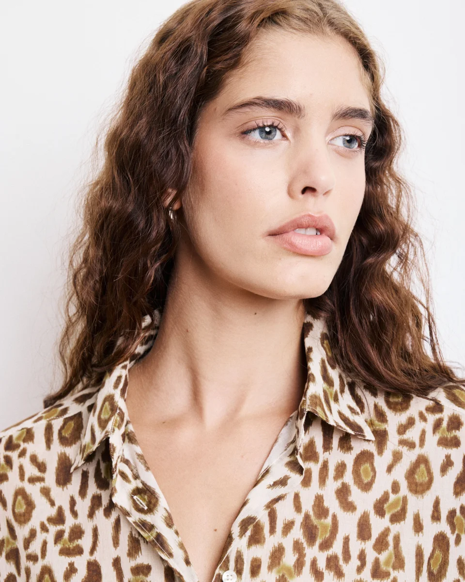 Chemise femme ample en voile de coton imprimé exclusif Léopard à manches longues. Emmanchures légèrement tombantes et patte de boutonnage apparente avec boutons en nacre.