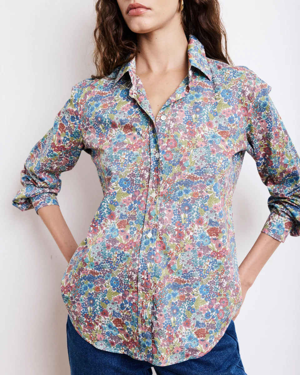 Chemise femme ajustée en popeline de coton imprimé Liberty. Patte de boutonnage apparente avec boutons en nacre. Pli d’aisance au dos.