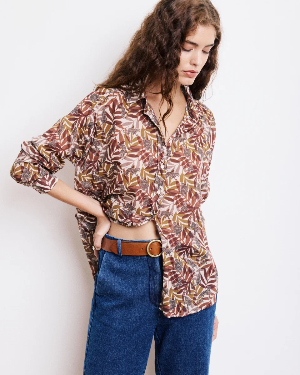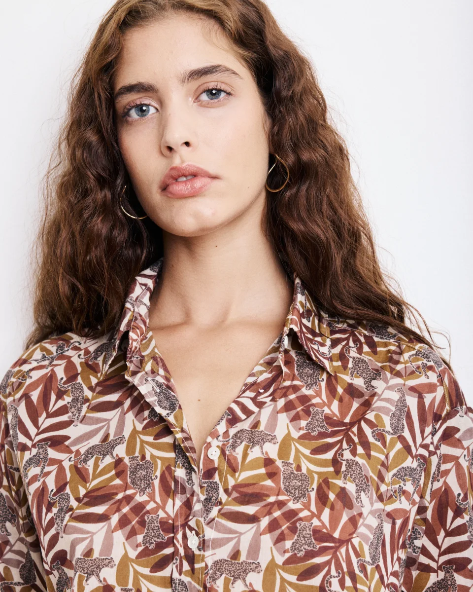Chemise femme ample en voile de coton imprimé exclusif Jungle à manches longues. Emmanchures légèrement tombantes et patte de boutonnage apparente avec boutons en nacre.
