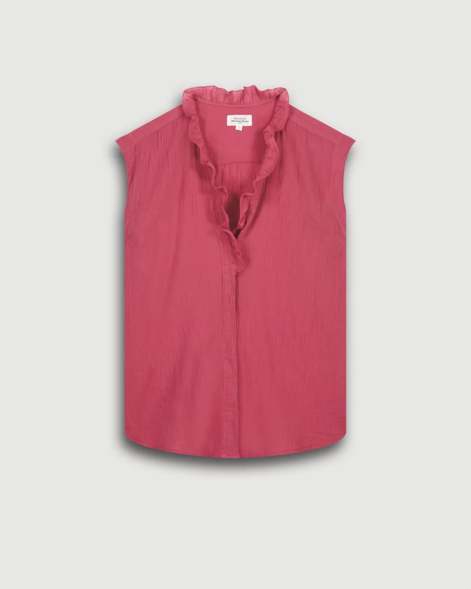 Chemise femme sans manches en crépon de coton. Col à volants avec détails de fronces aux épaules. Patte de boutonnage invisible avec boutons en nacre.