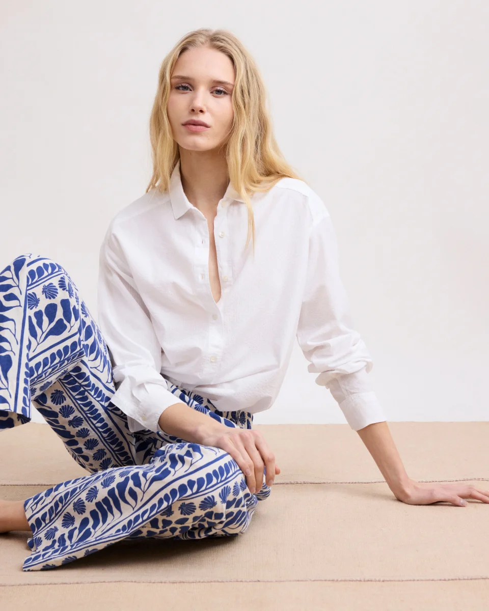 Chemise femme coupe ample en seersucker. Emmanchures tombantes et patte de boutonnage apparente avec boutons en nacre.