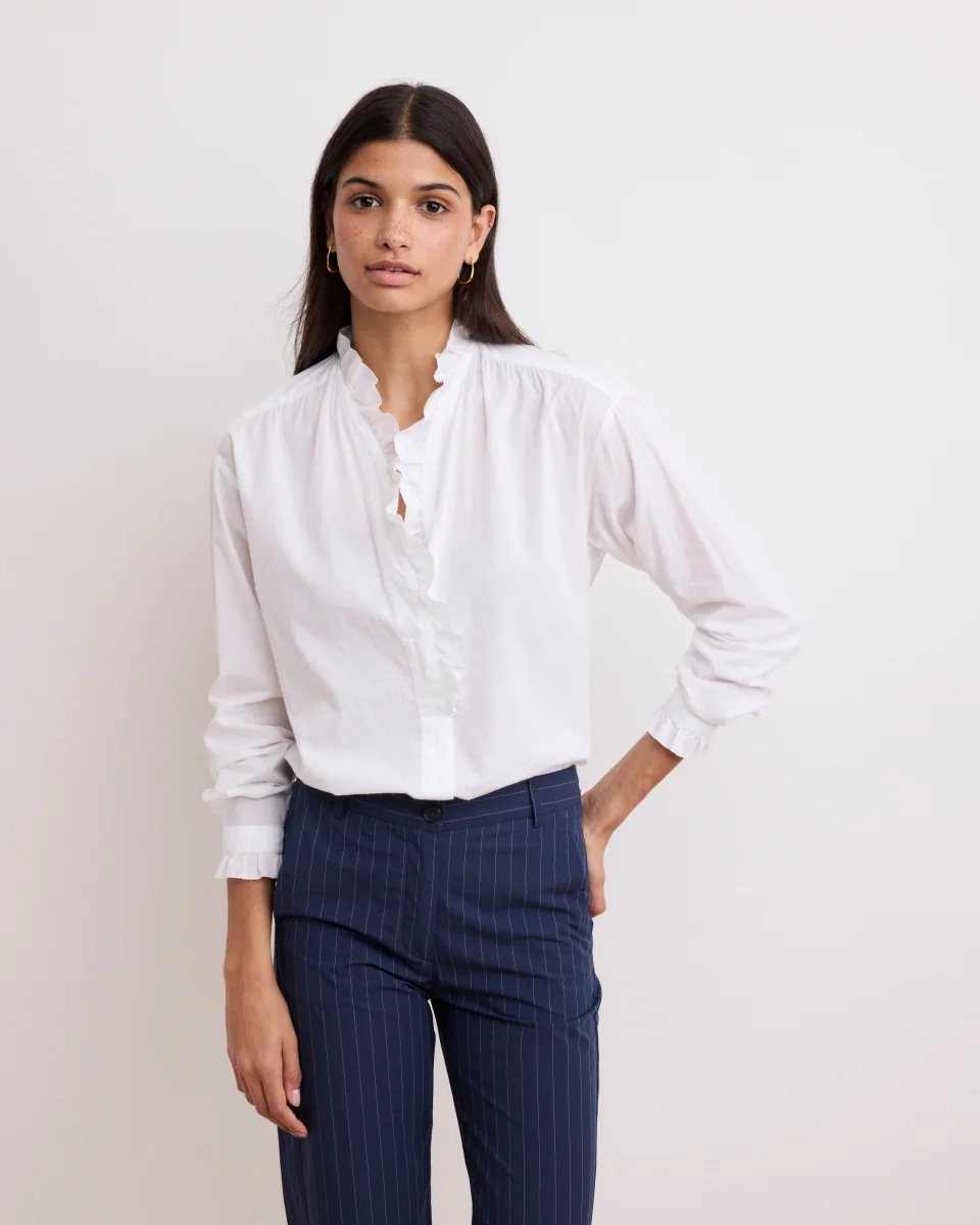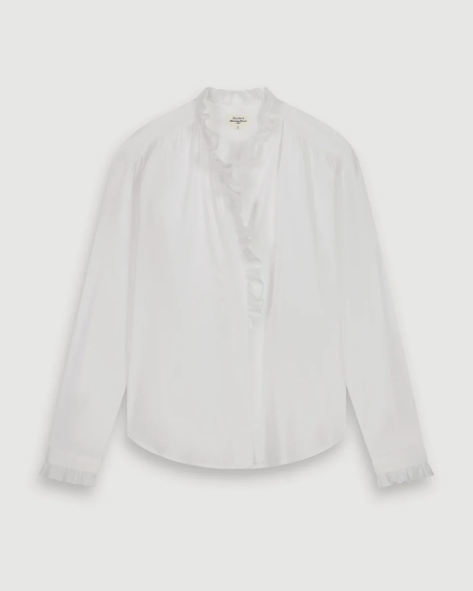 Chemise femme à manches longues en voile de coton. Col à volant, patte de boutonnage invisible avec boutons en nacre . Finition poignets à volants et détails de fronces aux épaules.