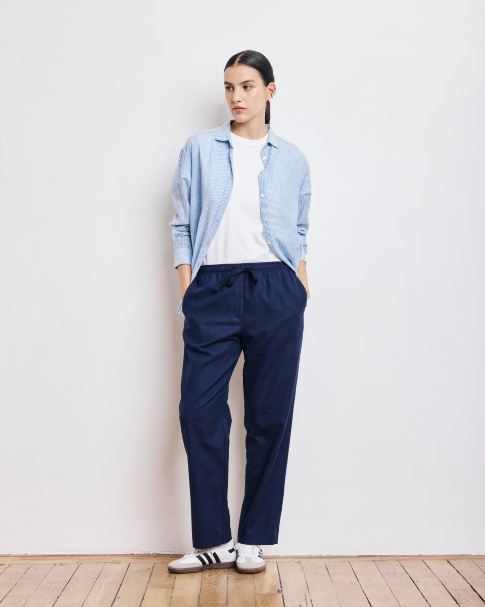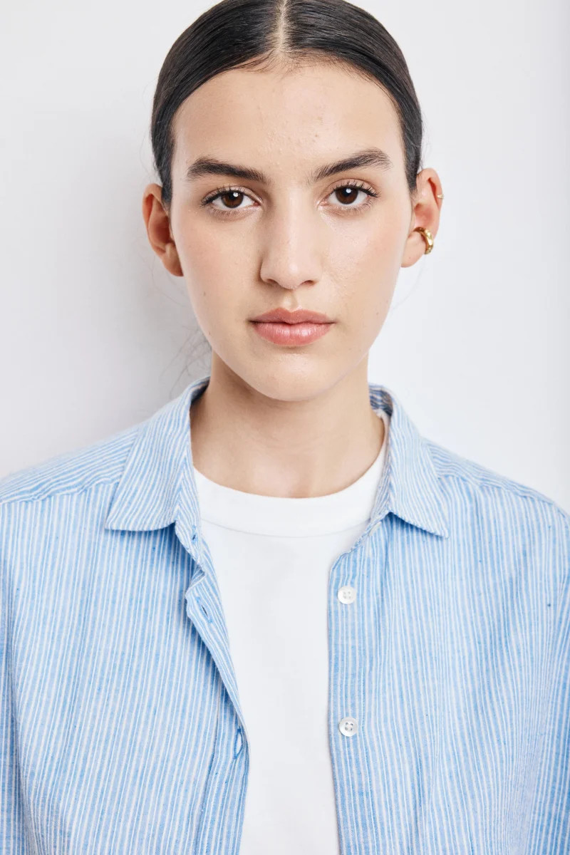Chemise femme ample en voile de coton à fines rayures. Emmanchures tombantes et patte de boutonnage apparente avec boutons en nacre. Bas arrondi, liquette.