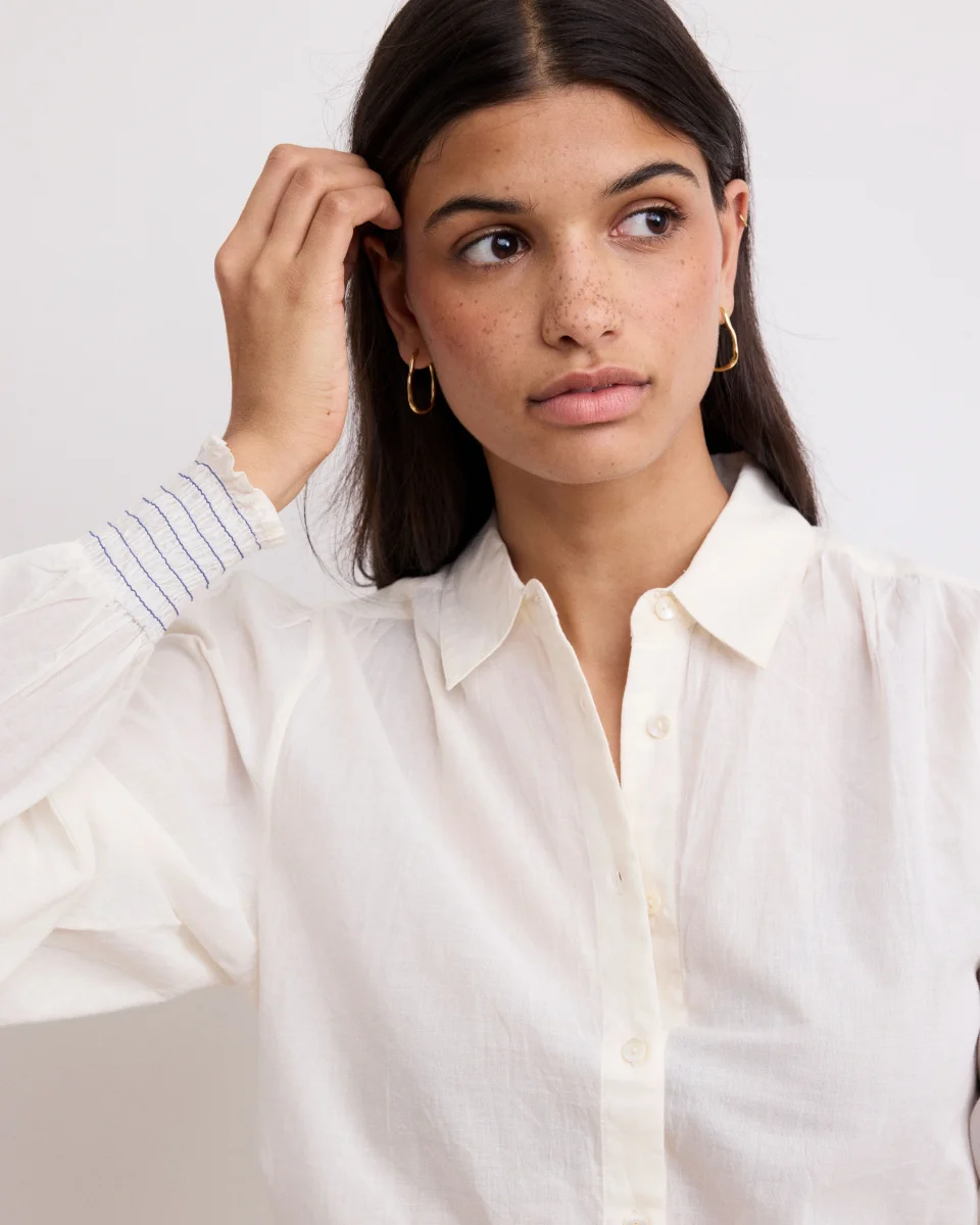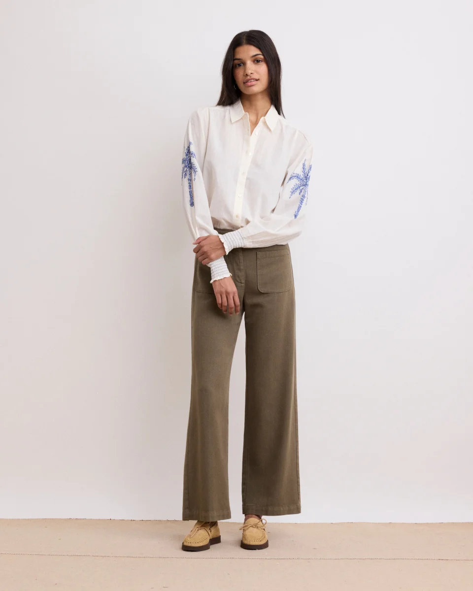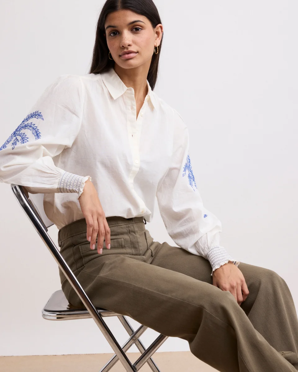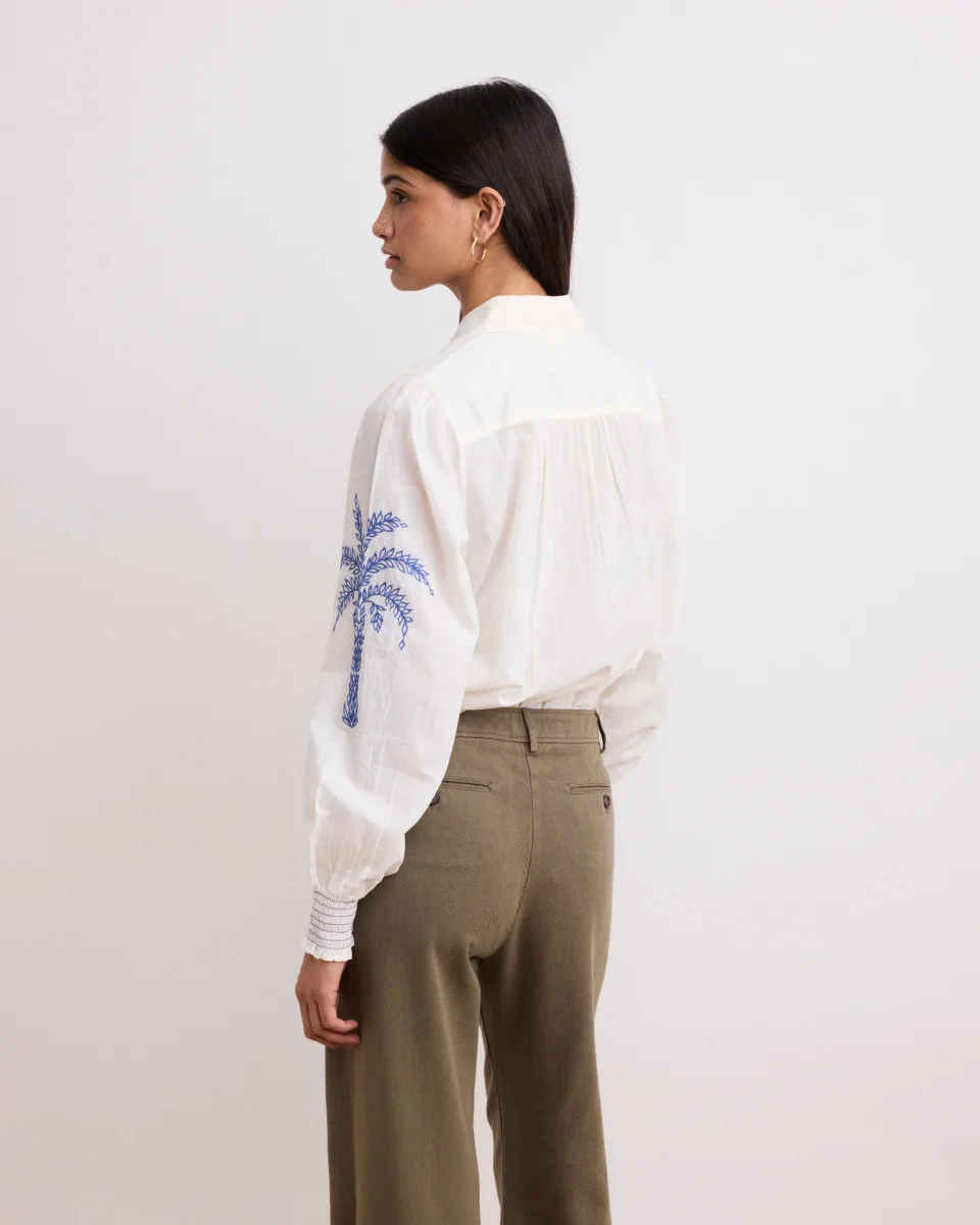 Chemise femme en voile de coton avec broderies palmiers bleus aux manches. Col chemise et patte de boutonnage apparente avec boutons en nacre. Manches amples brodées avec poignets smockés. Détails de fronces aux épaules et emmanchures