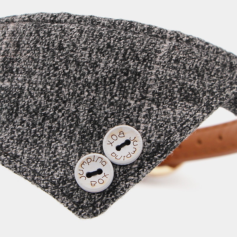 Classe et décontracté avec sa couleur gris chiné, ce collier bandana est agrémenté de deux boutons « Box Jumping » en bois blanc cousus à la pointe du foulard, lui donnant une petite touche raffinée.