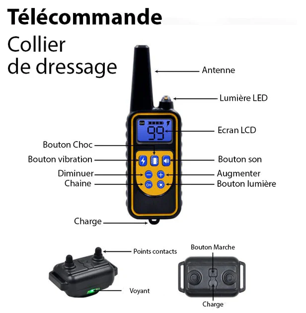 Le mode sonore et de vibration est parfait pour l’éducation et l’apprentissage de votre chien adoré. Le mode choc se révèle souvent efficace pour le dressage des chiens au comportement plus difficile ou agité.