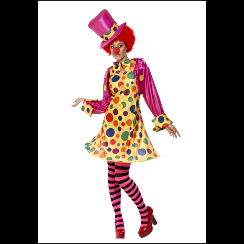 Costume de clown fantaisie pour femmeContient : une robe courbée, une chemise, un n&oelig,ud papillon et un chapeau.Les tailles disponibles sont : S (36-38), M (40-42) et L (44-46)