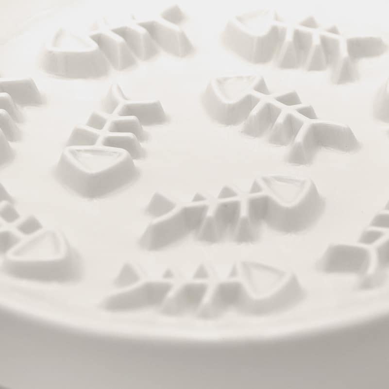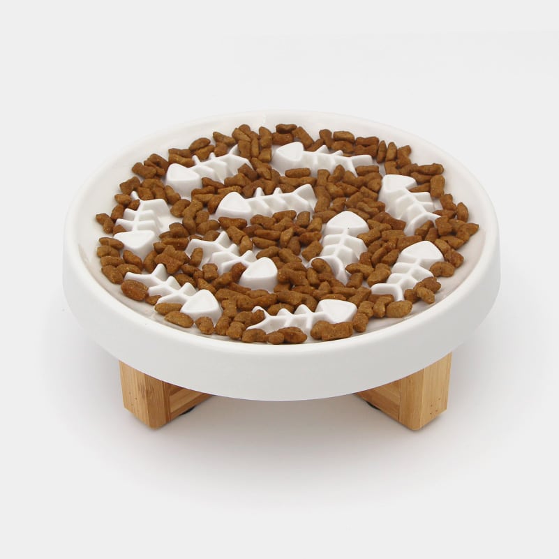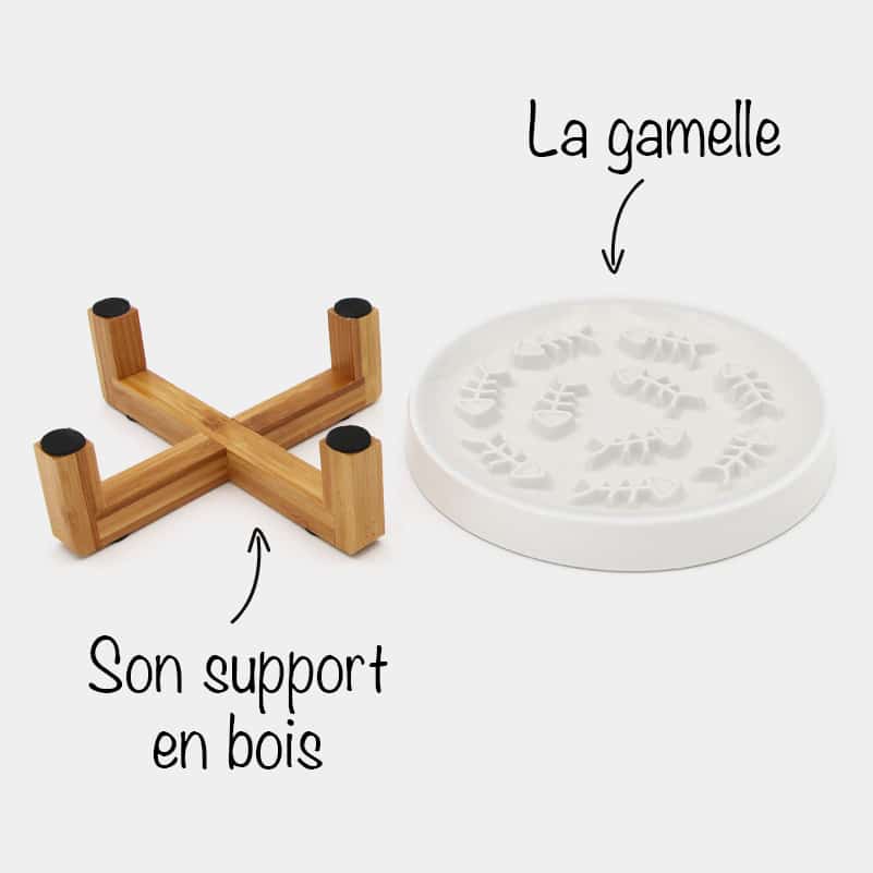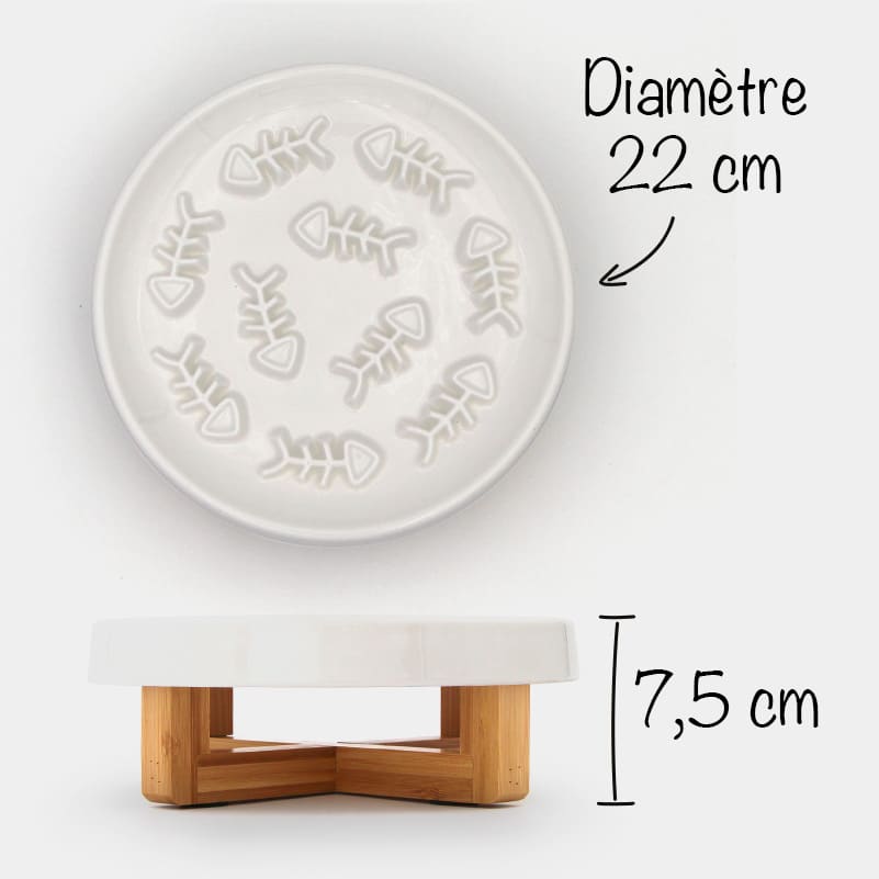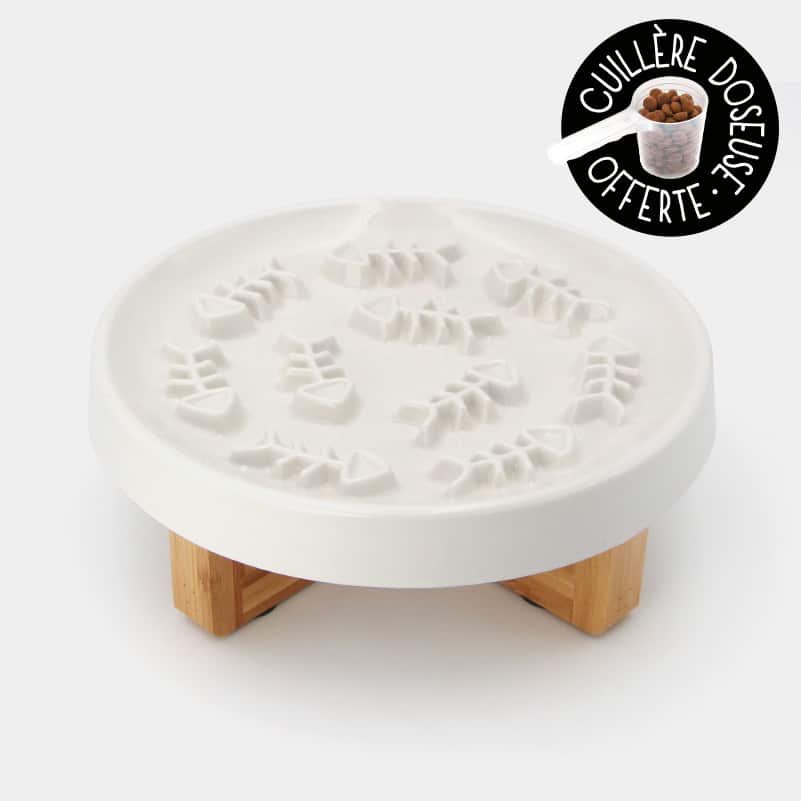 L’assiette en céramique est recouverte d’arêtes de poissons en relief, entre lesquelles votre chat s’amusera à déloger les croquettes avec l’une de ses pattes avant. Le socle en bois est équipé de quatre pieds antidérapants afin d’empêcher la gamelle anti-glouton de bouger lorsque le chat pose sa patte sur l’assiette.