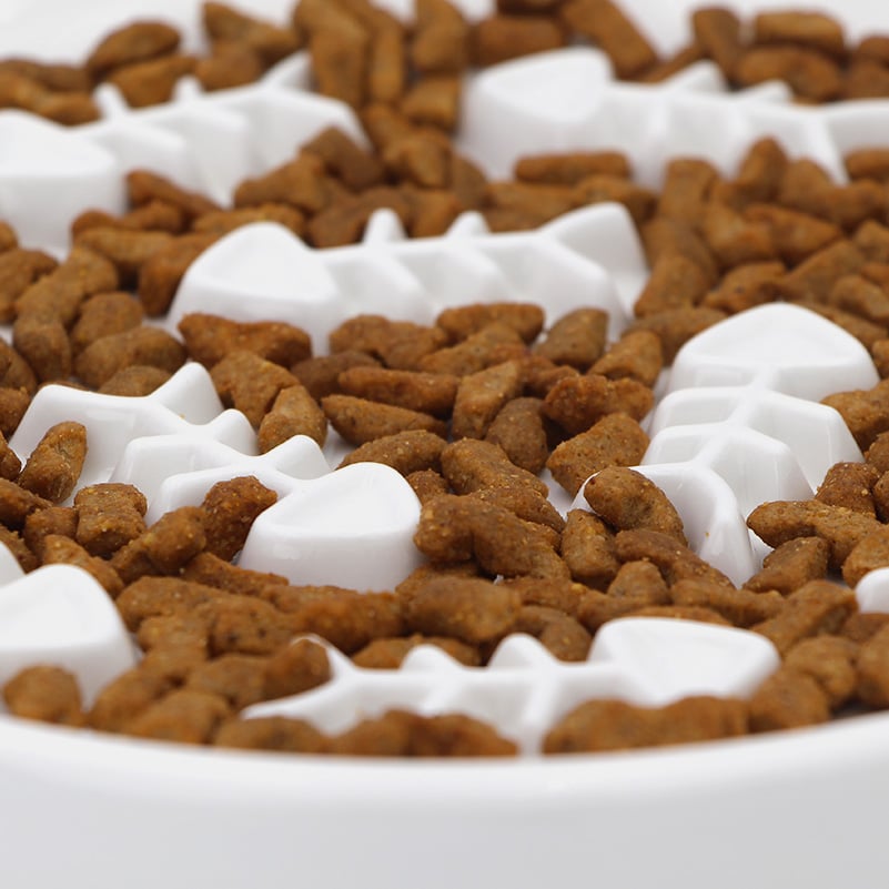 La gamelle anti glouton est particulièrement recommandée pour les chats manquant d’activité, comme les chats stérilisés sujets à une prise de poids, ou les chats d’appartement. Ainsi, plutôt que de laisser les croquettes en libre service toute la journée dans une gamelle classique, proposez-les à votre chat sur cette gamelle anti-glouton en céramique. Cela permettra de ralentir sa prise alimentaire, favorisera sa satiété et contribuera à maintenir son poids de forme.