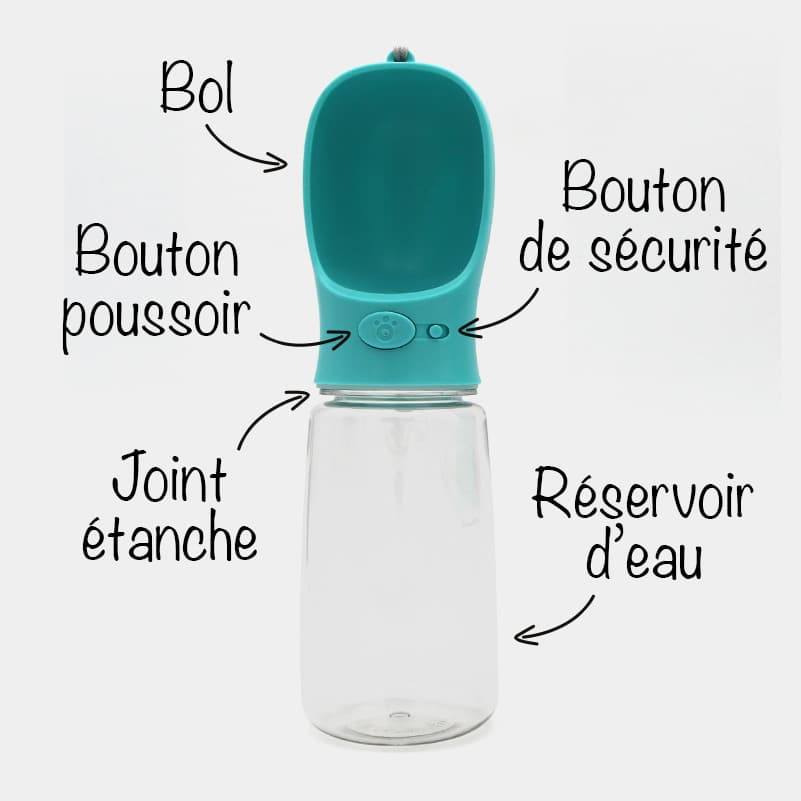 La gourde comporte un bouton de sécurité afin d’éviter à l’eau de couler pendant le transport. Un joint positionné entre le réservoir et le bol assure également une étanchéité parfaite.