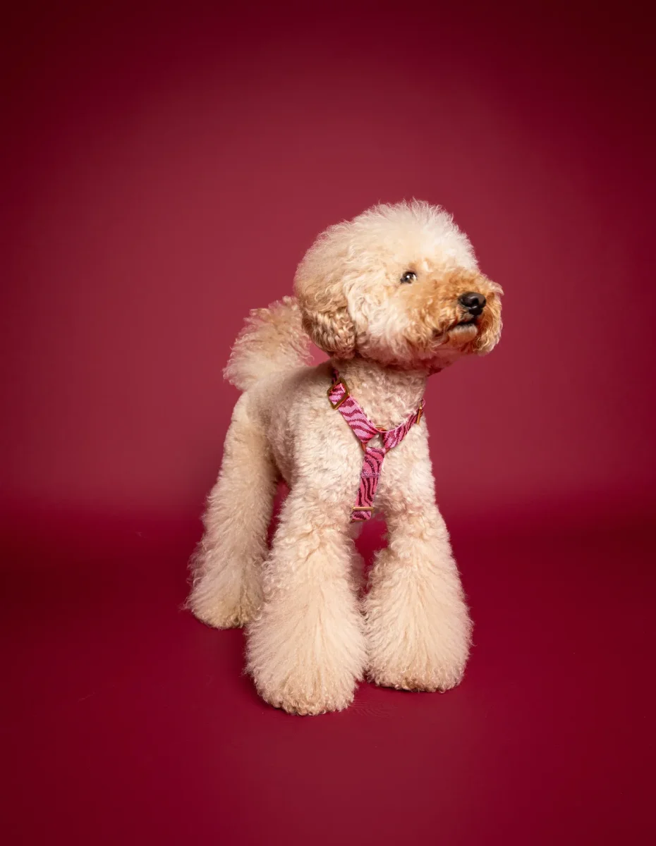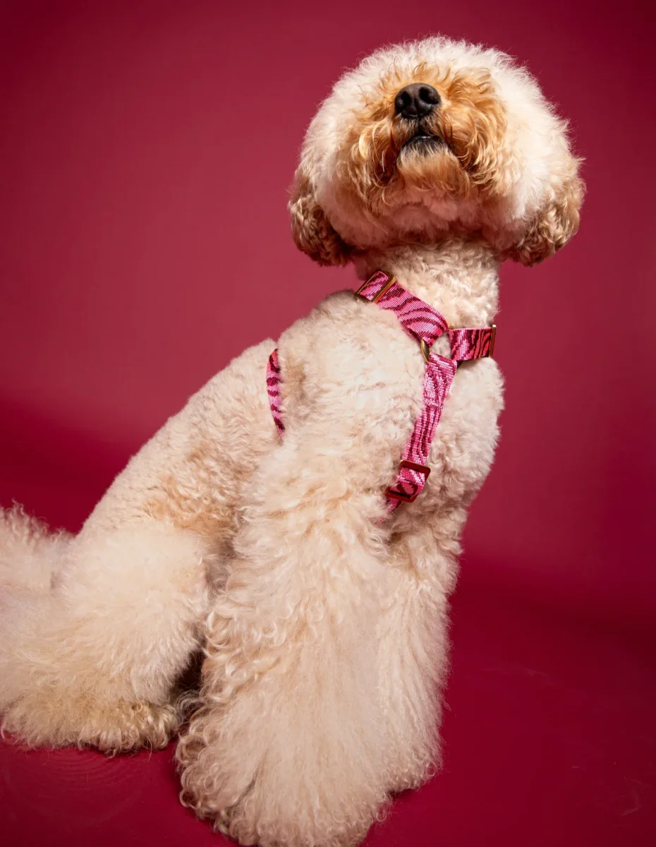 Harnais aux motifs tigrés rose et bordeaux en nylon. Pour un total look, vous pouvez également retrouver le collier et la laisse dans notre sélection.