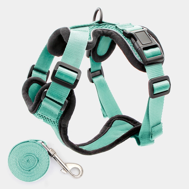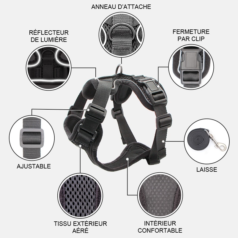 Contrairement au collier, le harnais répartit la pression sur le thorax et les épaules, ce qui évite tout risque d’étranglement ou de blessure.