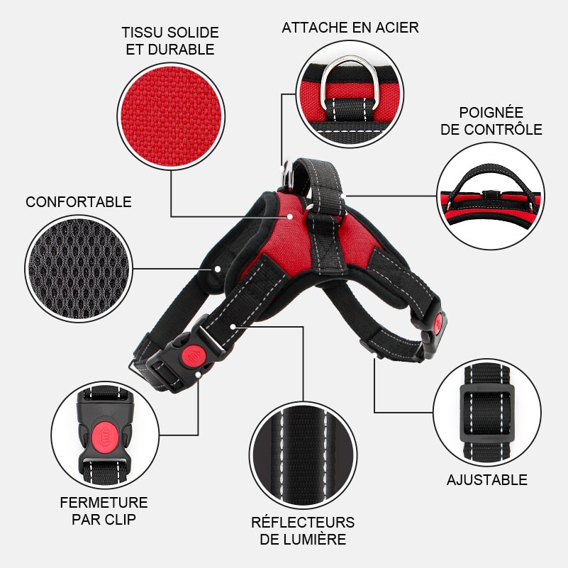 Pour que le harnais soit efficace, celui-ci doit être parfaitement adapté à la corpulence et à la morphologie de votre chien. Vérifiez bien que le harnais soit correctement positionné, pas trop serré et que les attaches ne gênent pas le chien.