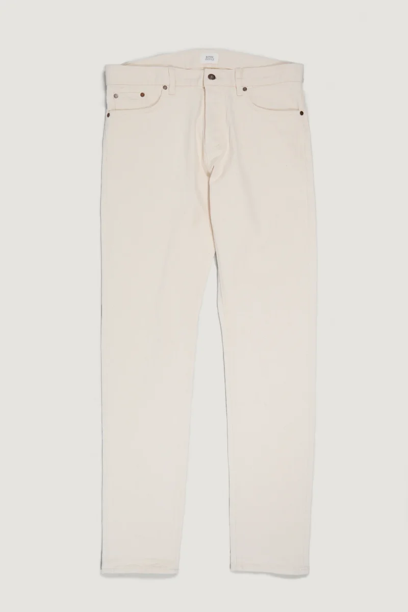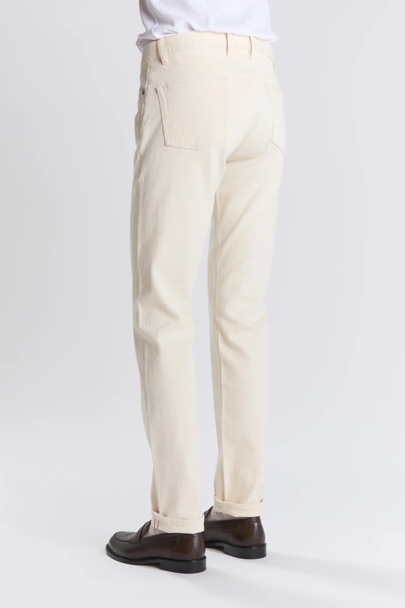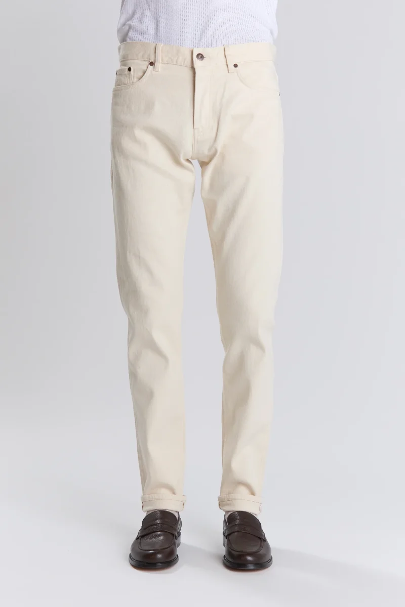 Le jean Alberto, best-seller de notre collection depuis plus d’une décennie, se décline dans une toile écrue selvedge pleine d’aspérités du réputé tisseur italien Candiani.