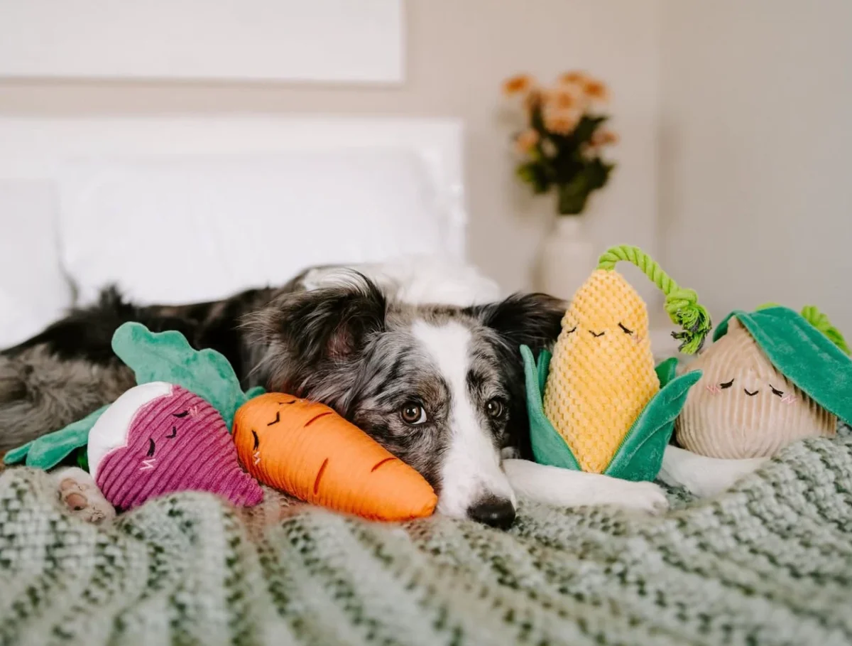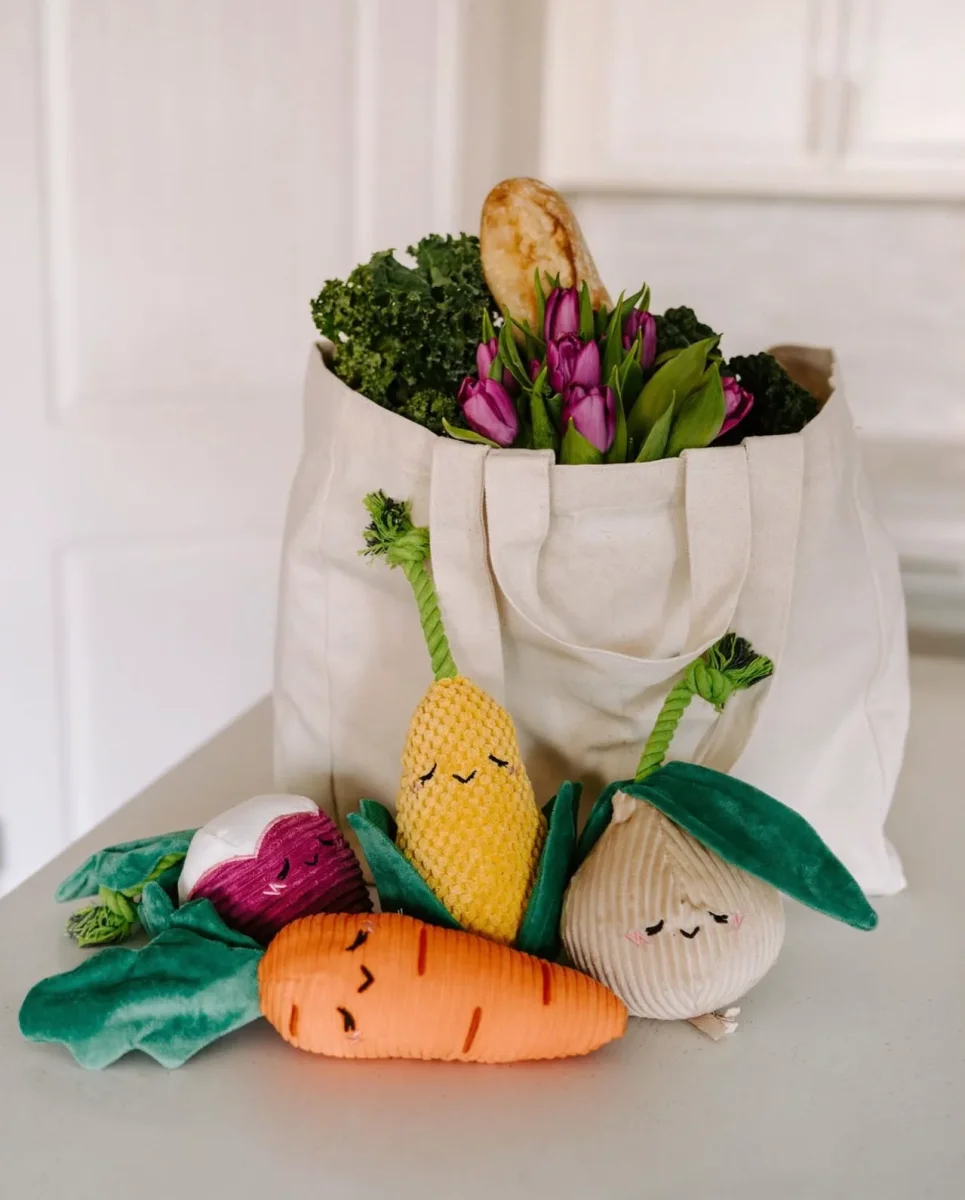 Le jouet peluche Crinkle Crops Carrot présente un mélange de tissus, des feuilles froissées et une corde en coton sortant du dessus et comprend un grand couineur rond. Un jouet adapté pour les chiens qui aiment mâchouiller et mordiller.