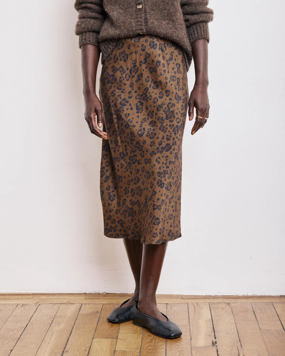 Jupe femme taille élastique en satin de viscose imprimé léopard exclusif. Coupe biais et longueur genoux.
