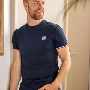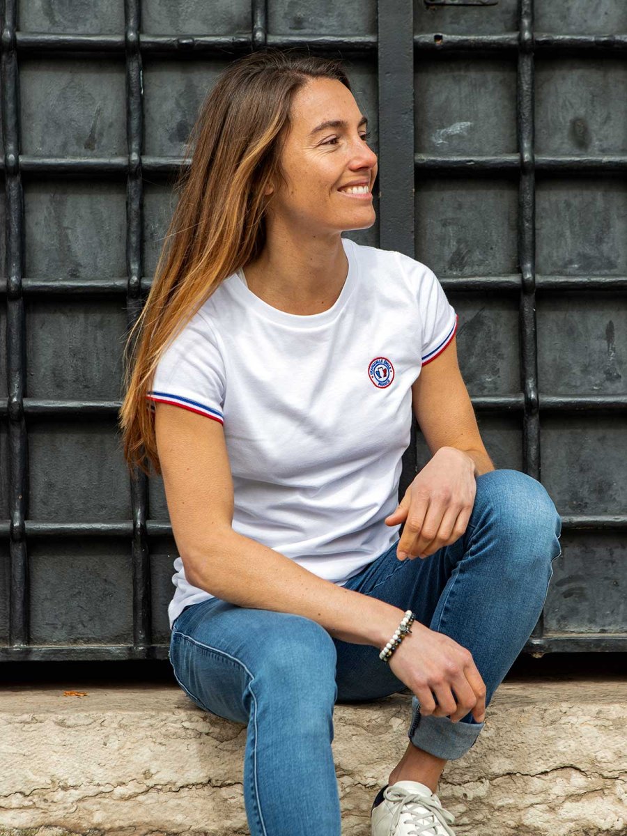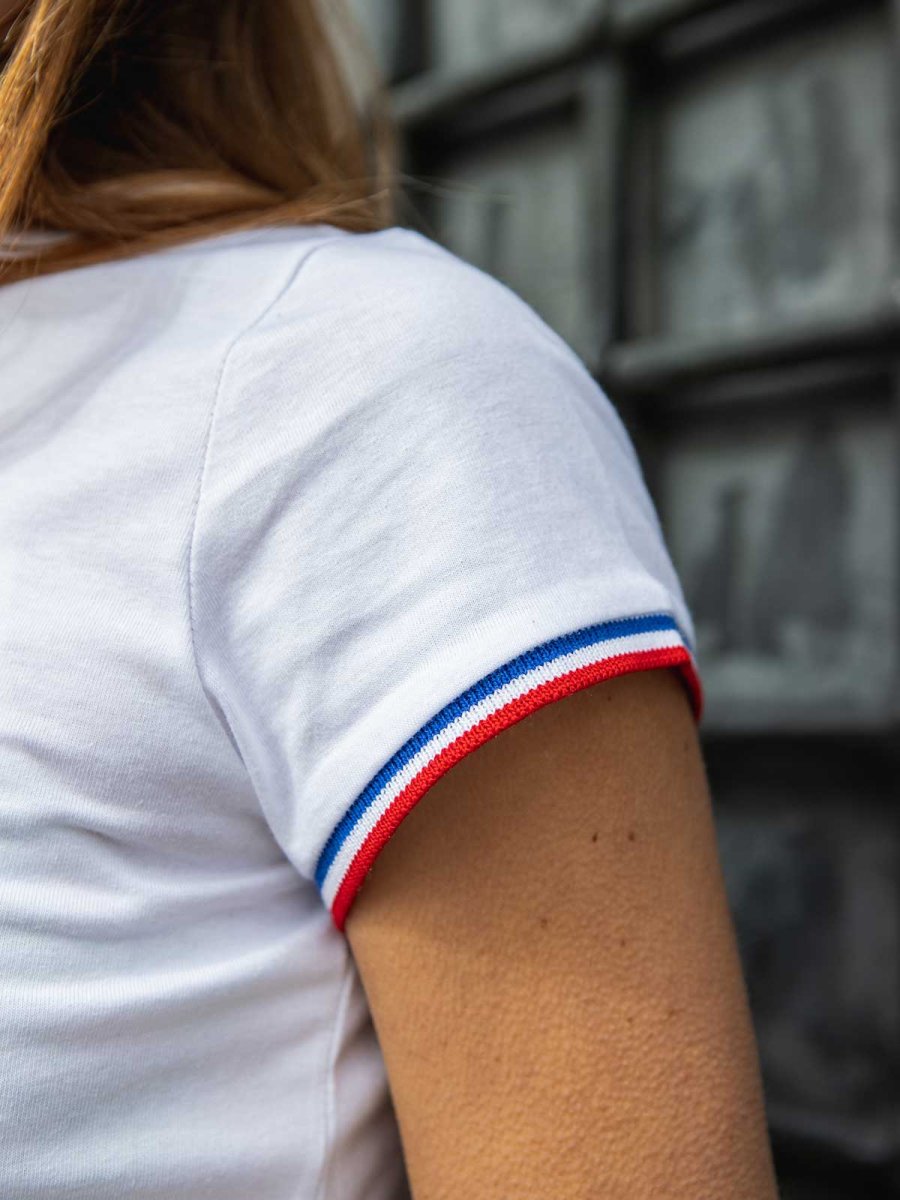 Une version revisitée de l’intemporel t-shirt blanc avec la cocarde Tranquille Emile finement brodée au cœur et des bords-côte tricolores aux manches. Coupe féminine légèrement ajustée avec un col fin et évasé.