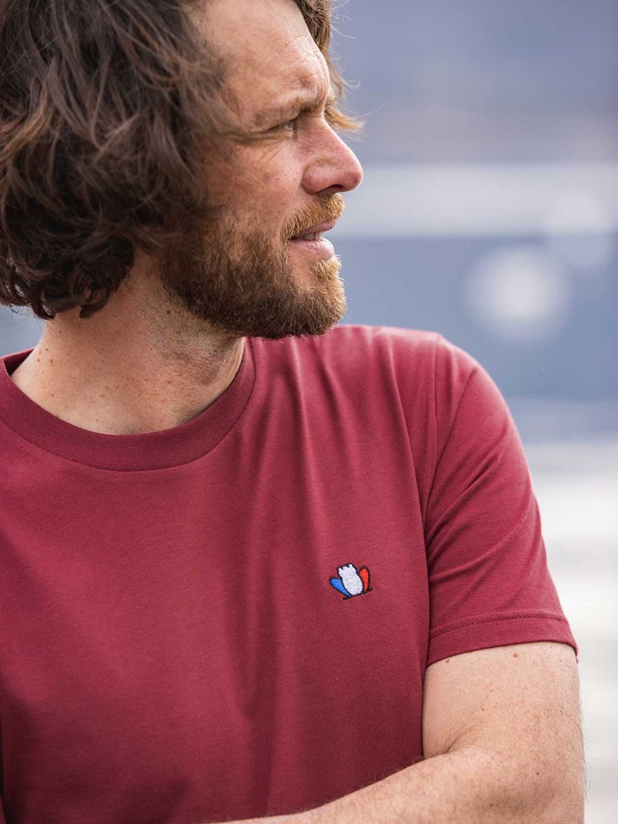 Blanc, noir, safran, bleu et aussi rouge bordeaux ! L’Authentique 3.0, notre t-shirt homme, se décline avec un nouveau coloris incontournable. Une couleur chaude et aussi douce que notre jersey 100% coton bio et son ruban en satin tricolore au col toujours 100% Made in France.
