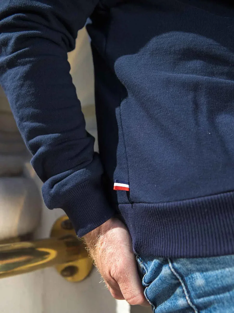Le Confortable 3.0, notre sweat à capuche unisexe bleu marine, est 100% coton bio et véritablement Made in France .