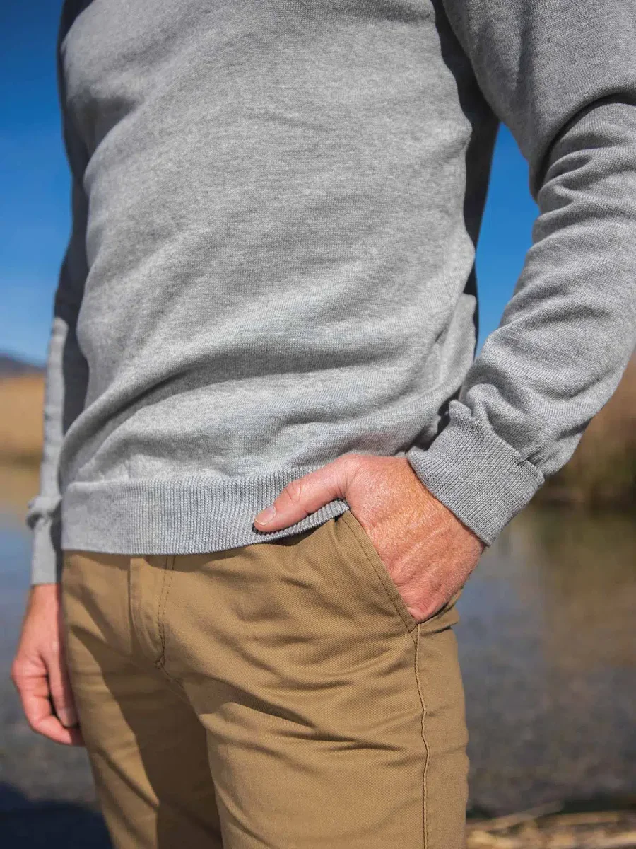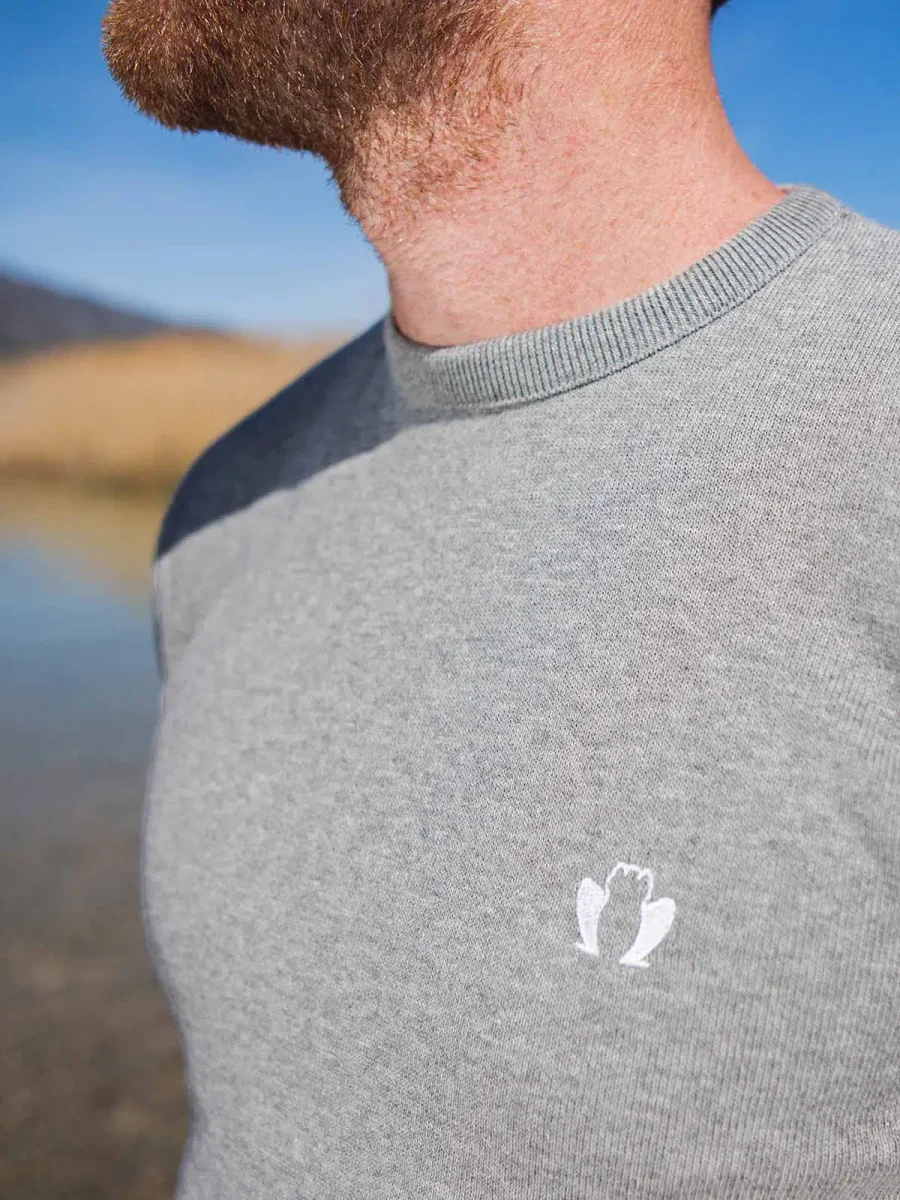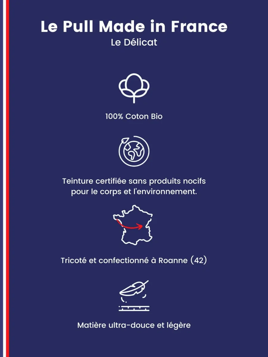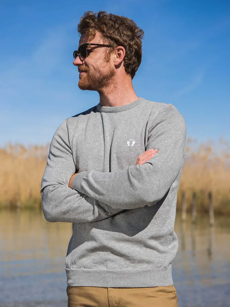 Bio et fabriqué à côté de chez vous. Le Délicat est notre nouveau pull fin en 100% coton bio. Avec sa maille légère, son col rond ras-du-cou bien plaqué et son coloris gris chiné intemporel, notre pull en coton bio se porte en toute occasion sur un t-shirt comme une chemise.