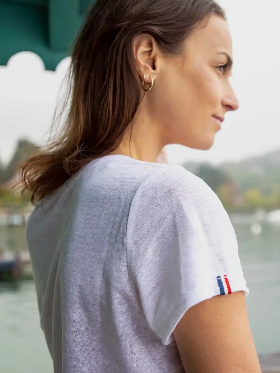 Un incontournable dans le vestiaire Tranquille Emile avec notre t-shirt femme en 100% lin. Idéal pour rester au frais l’été avec sa matière aérée, notre t-shirt en lin blanc a une coupe légèrement ajustée pour mettre en valeur votre silhouette sans vous serrer. Notre t-shirt est fabriqué dans notre atelier de Brignais pour une empreinte carbone la plus réduite possible. : du 100% Made in France!