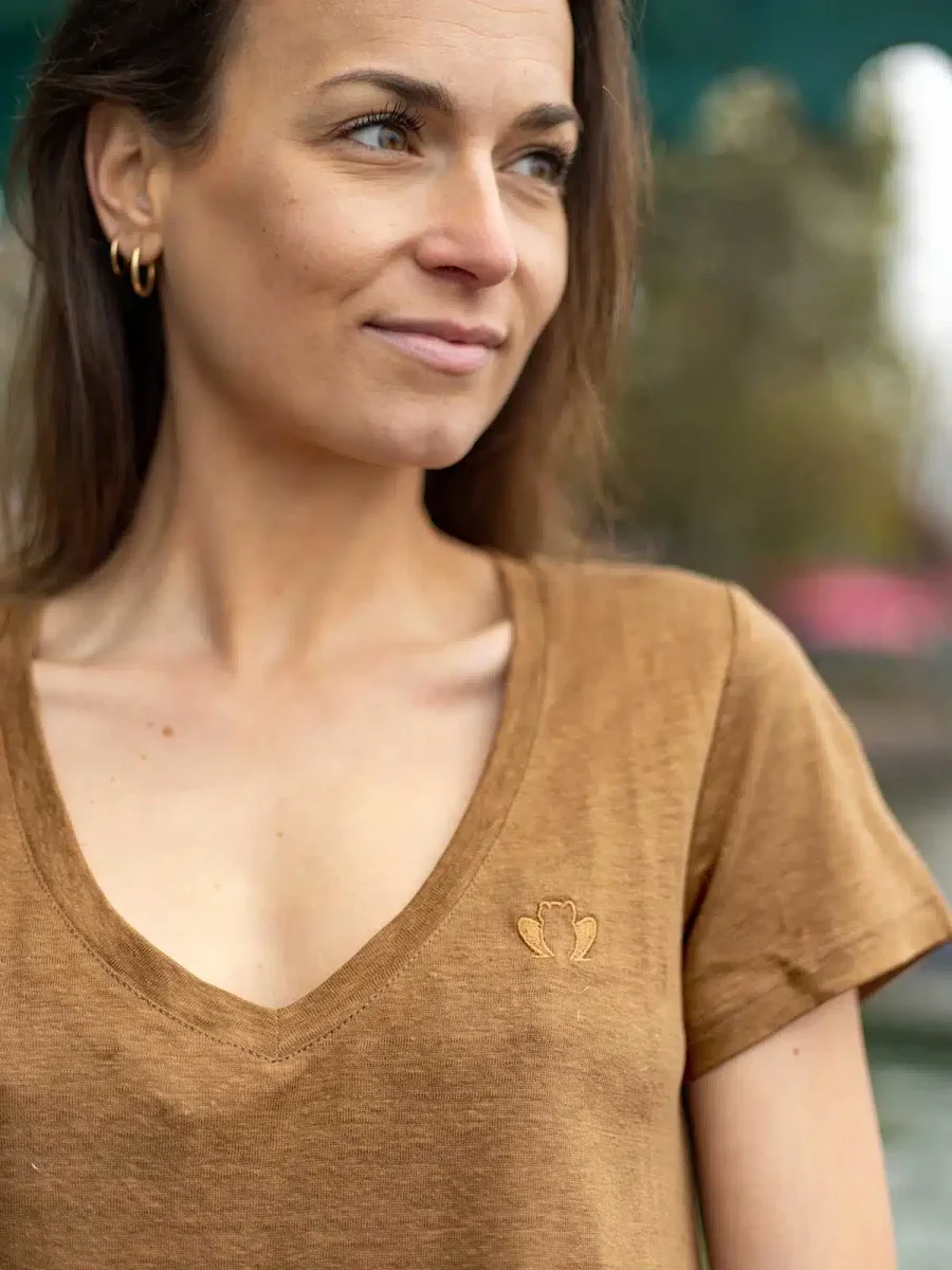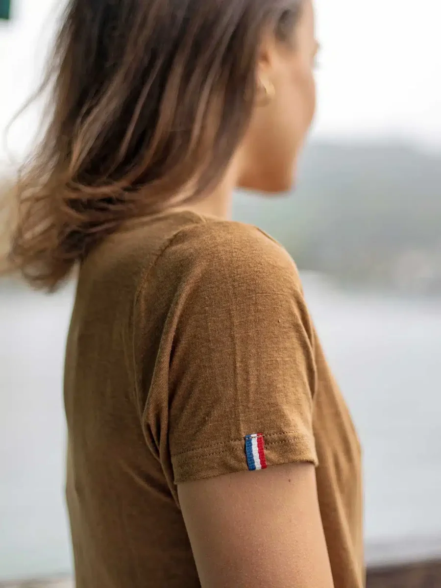 Votre meilleur allié pour l’été ! Découvrez L’Indispensable notre t-shirt femme lin en coloris brun avec des nuances sépia donnant un ton plus frais et naturel. Jersey 100% lin avec un grammage de 190 g/m² pour un t-shirt durable et aéré pour tout l’été.