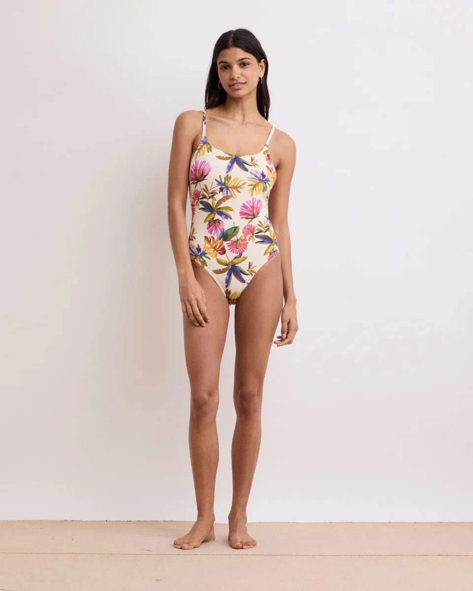 Maillot de bain femme une pièce imprimé exclusif « Feuilles et Fleurs ». Décolleté en U et fines bretelles réglables.