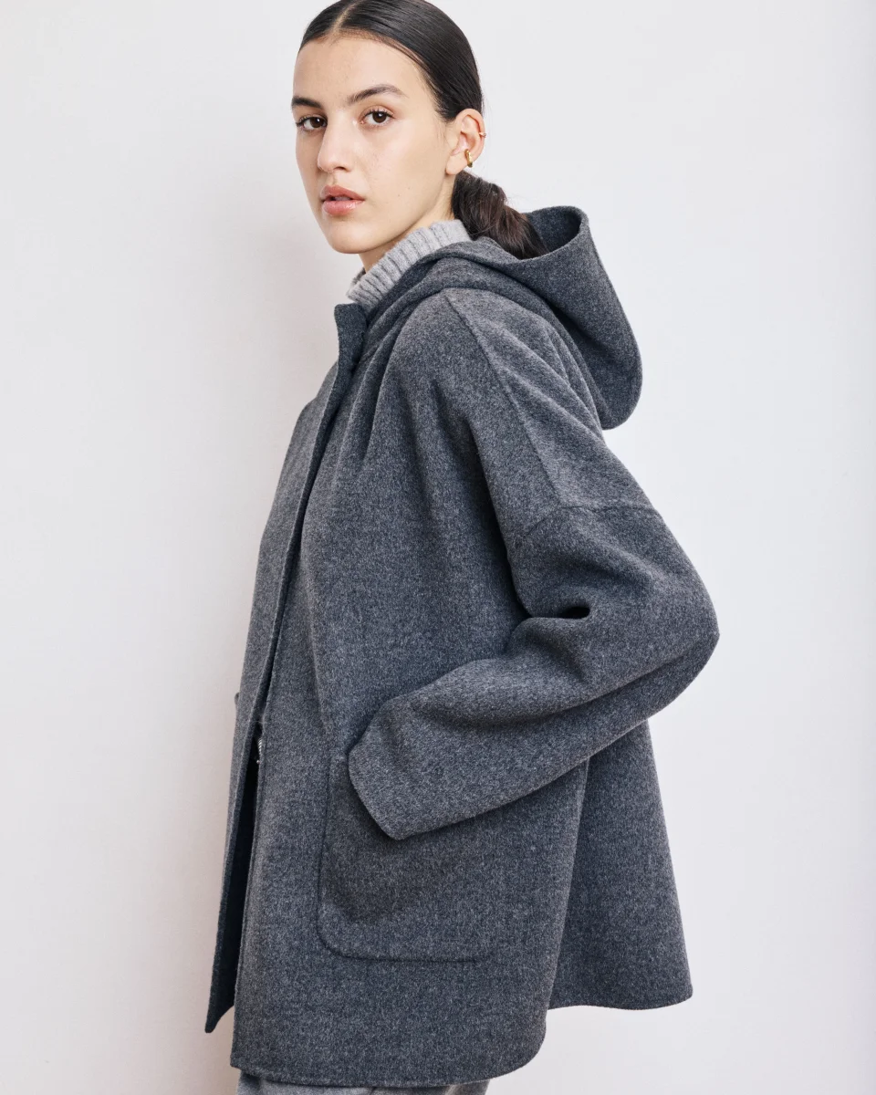 Manteau femme ample à capuche d’inspiration cape en laine double face. Emmanchures tombantes, fermeture par un bouton à l’encolure et deux poches plaquées devant.