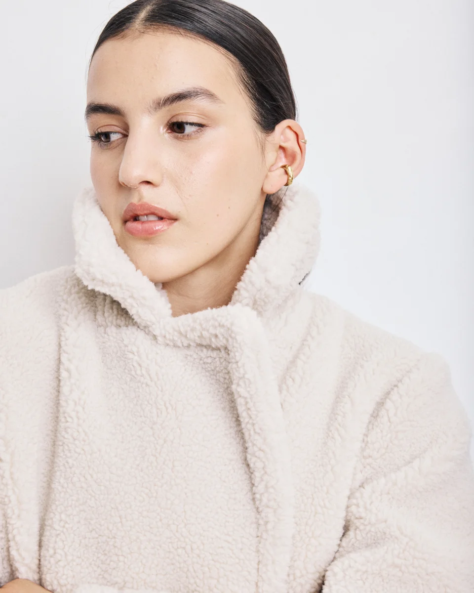 Manteau femme court esprit caban en sherpa. Emmanchures légèrement tombantes et deux poches biais latérales. Double patte de boutonnage et doublure imprimé exclusif léopard.
